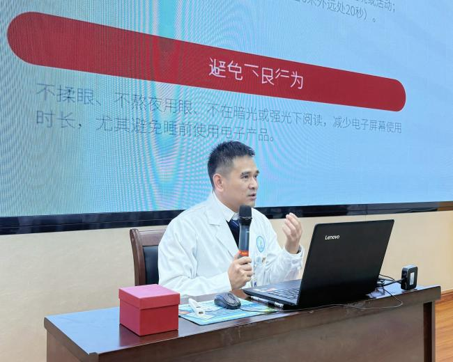 讲座环节,我院眼科副主任范明纯医生作为授课专家全程参与活动,他不仅是广西“明眸皓齿 壮美少年”儿童青少年近视综合防控专家组的核心成员,还担任《防城港市2025年度社会事务进校园事项白名单》科普宣讲专家。范主任专业素养扎实和临床经验丰富,通过形象直观的图片展示和通俗易懂的语言表达,从近视的发生机制、潜在风险以及实用防控方法等多个维度进行了全面且深入的阐释,为师生们开展了形式生动的近视防控专题讲座。同学们专注聆听、积极思索,不少同学还主动记录笔记,现场学习氛围浓厚。