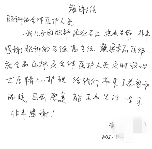 近日,我院眼科(视光中心)收治了一名因眼部严重出血不止、生命垂危的患儿。在科室医护人员的迅速反应与精准救治下,患儿转危为安,并顺利康复出院。出院当天,患儿母亲黄女士(化名)亲手写下感谢信;复诊之日,又送来锦旗以表达对医护人员深深的感激之情。