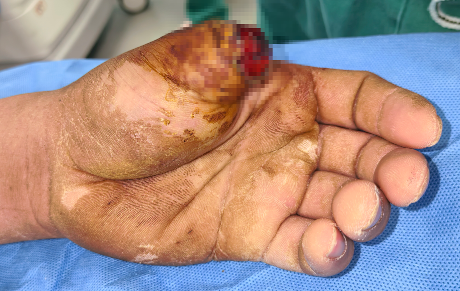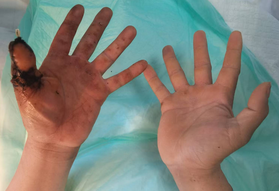 患者因重物压榨伤,致左拇指近节中段以远毁损缺失到我院治疗,诊断为左拇指Ⅲ度缺损。文昌骨科二区显微外科团队评估伤情,认为拇指功能占全手功能的40%—50%,拇指缺失,不仅影响外观,而且严重影响手部握持功能,对日常工作生活影响较大,建议行拇指再造术。