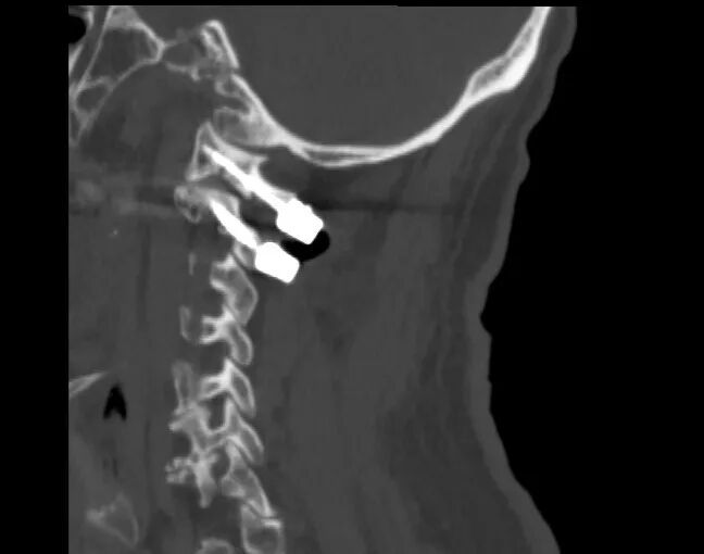 为最大限度保障患者安全与疗效,文昌院区骨科一区团队联合麻醉科、心血管内科、老年病科等多学科进行全面评估,反复优化手术方案,制定周密的应急预案。最终采用后路寰枢椎侧块钉棒系统内固定+植骨融合术:在影像导航辅助下,毫米级精准置钉,完美避开椎动脉与神经根;稳妥复位脱位关节,彻底解除脊髓压迫;采用坚强内固定+植骨融合,实现短期稳定、长期融合的理想效果。