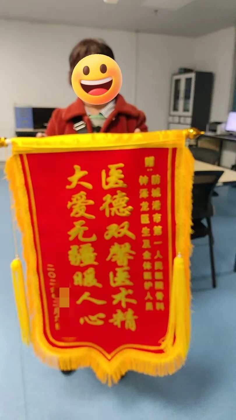 前,我院防城院区骨科收到了一份特殊的感谢——曾因车祸致右掌骨骨折的颜阿姨(化名)在出院两个月后专程返回医院,将一面印有“医德双馨医术精,大爱无疆暖人心”的锦旗送到了主管医生钟泽龙及全体医护人员手中。这份真诚的致谢,不仅是对医护团队专业诊疗与暖心服务的真挚认可,更是对科室综合服务能力的高度肯定。