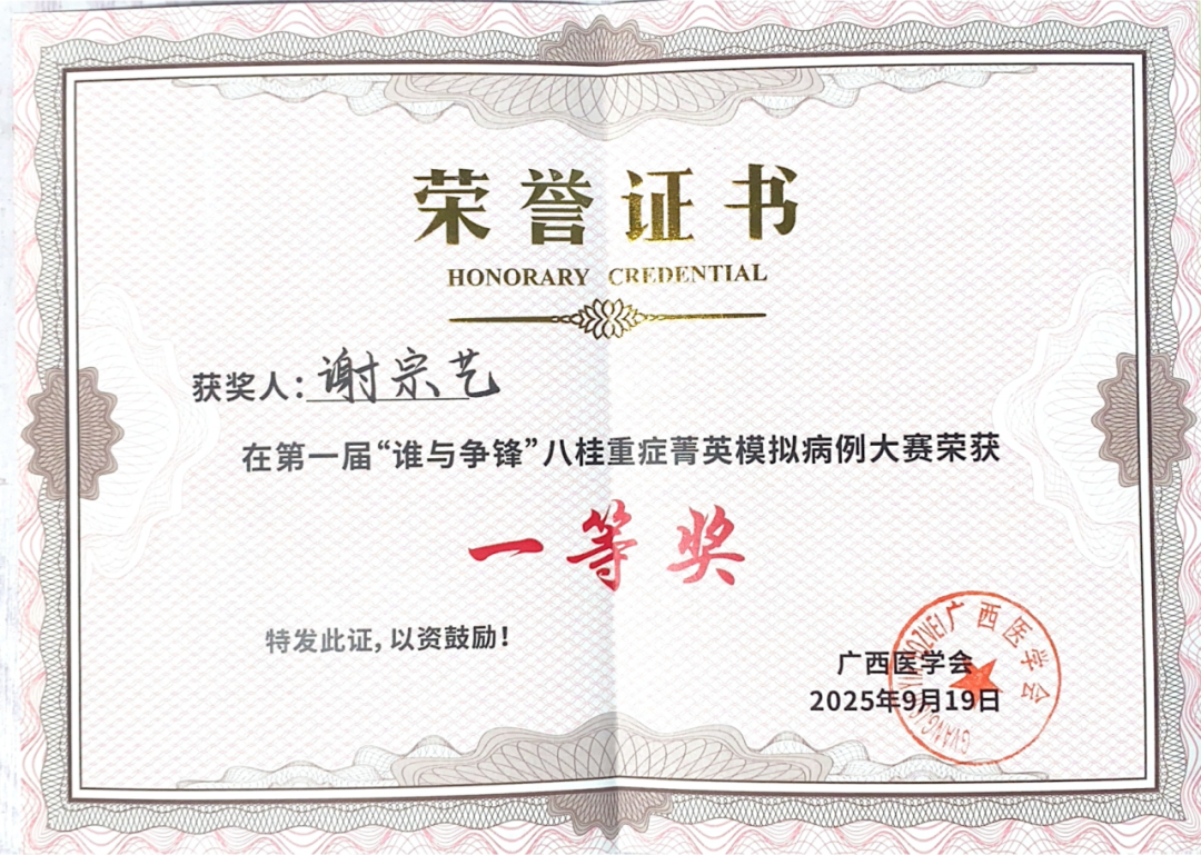近日,由广西医学会重症医学分会年会举办的第一届“谁与争锋”八桂重症菁英模拟病例大赛在柳州圆满落幕。我院重症医学科谢宗艺副主任医师所在的“扬帆队”(桂南代表队:由钦州、北海、防城港及南宁各一家医院医护代表组成)凭借扎实的理论功底、娴熟的实践操作和卓越的团队协作,在全区各参赛队伍中脱颖而出,斩获大赛一等奖。