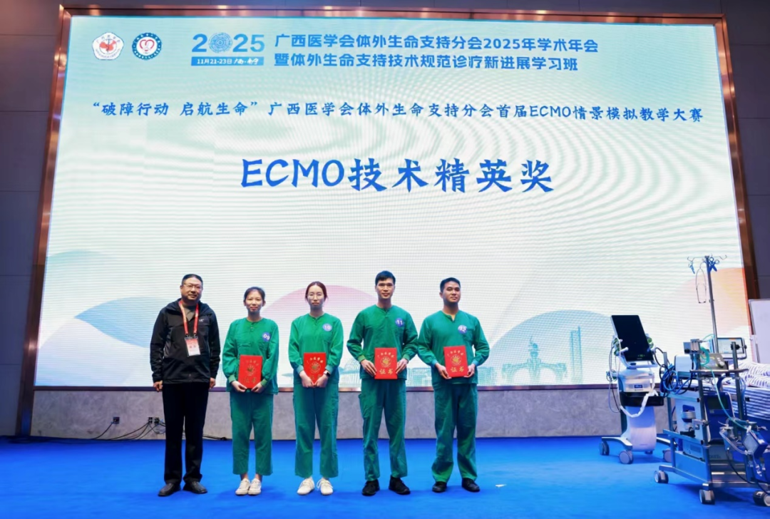 近日,在广西医学会体外生命支持分会2025年学术年会举办的首届“破障行动 启航生命”ECMO情景模拟教学大赛中,我院重症医学科ECMO团队卢世营护师作为钦北防赛队核心成员,与队友团结协作,凭借出色的专业能力和应急处置水平,在激烈角逐中脱颖而出,荣获大赛“ECMO技术精英奖”。
