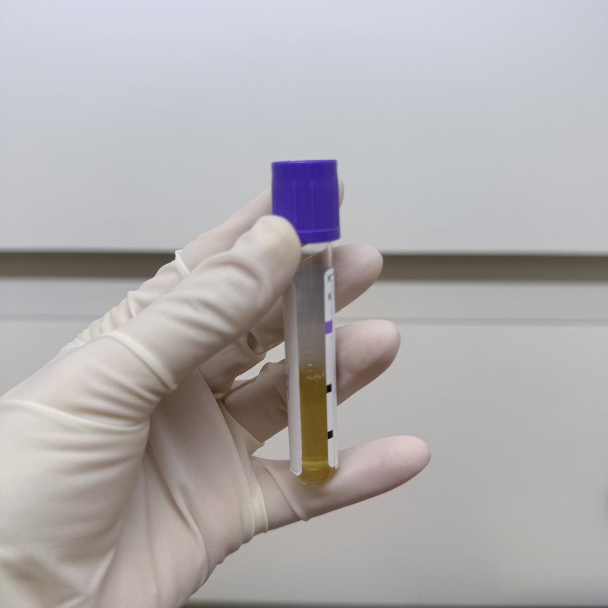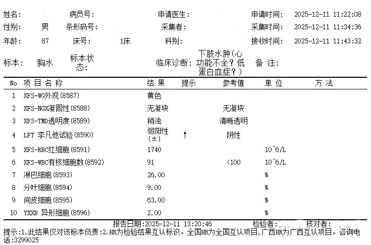 我院医学检验科接收到患者胸腔积液标本之后,立即按照胸腔积液常规检测流程开始检验:观察标本外观、颜色、有无凝块、是否浑浊。