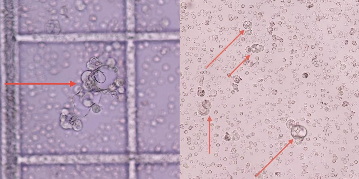 ▲高倍镜下(40X)有空泡感的成团细胞(计数板加涂片镜检、未染色)