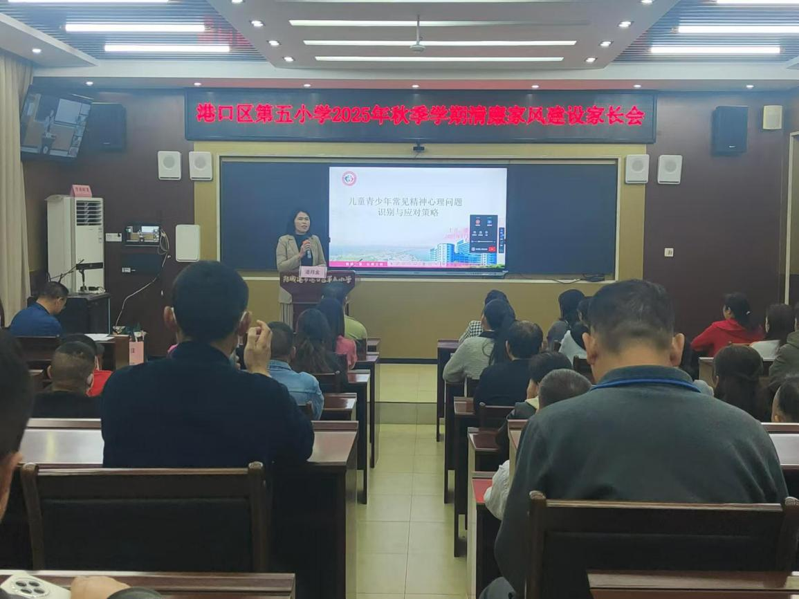 为加强儿童青少年心理健康教育,搭建家校协同育人桥梁,帮助家长科学识别孩子成长过程中的心理信号,近日,我院在港口区第五小学举办了《儿童青少年常见精神心理问题的识别及应对》专题讲座。本次讲座由我院临床心理门诊潘月金医生主讲,采用“线下讲座+班级直播”相结合的方式,覆盖学校领导、教师以及一至六年级全体家长,累计参与学习的家长达1200余人。