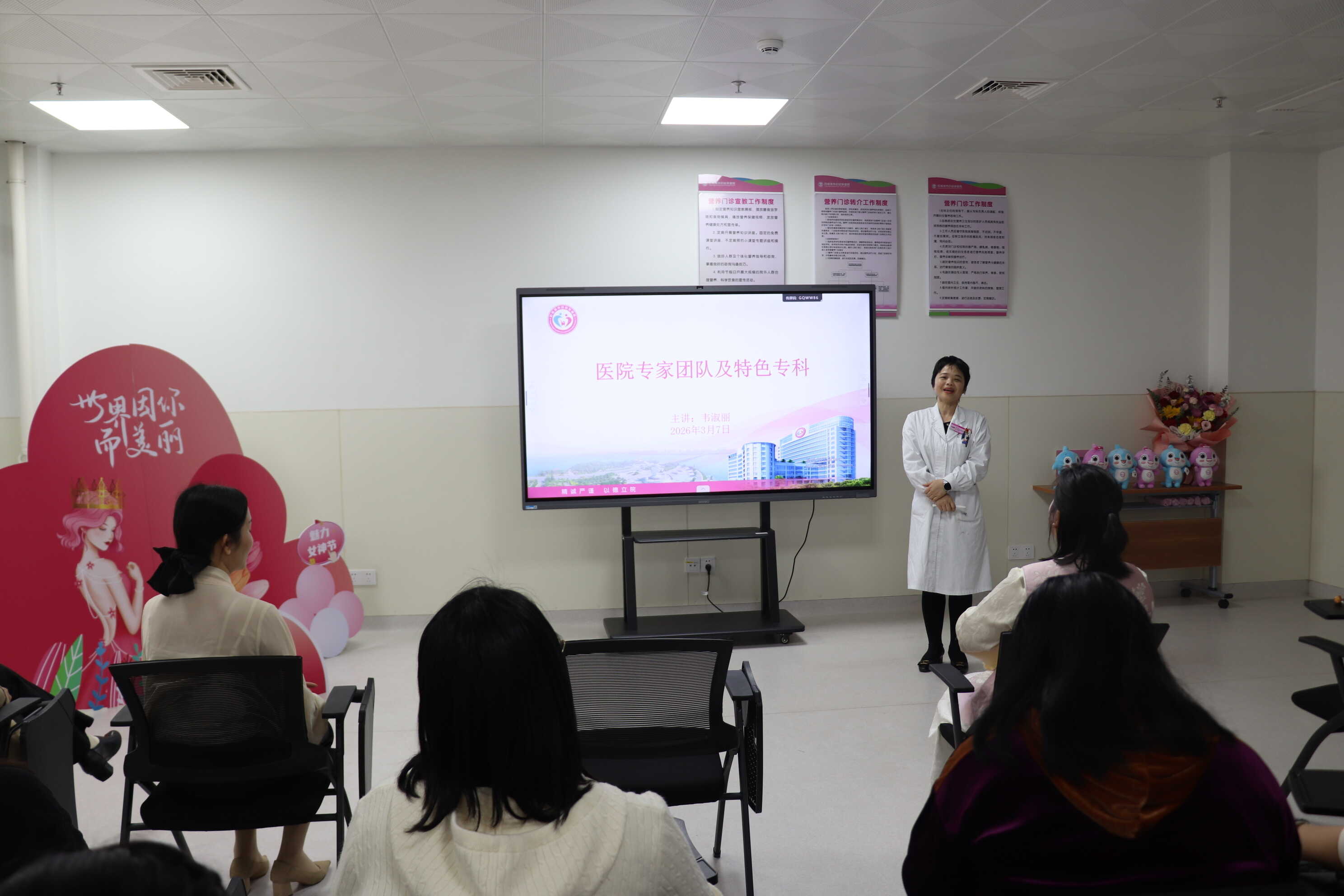 活动在温馨热烈的氛围中拉开帷幕。妇产科党支部党员骨干与专科专家组成科普团队,由韦淑丽副院长作医院特色专科介绍,中医科吴敏萍副主任作中医保健科普讲座,把优质妇幼健康服务与中医养生理念送到教育一线,围绕女性全生命周期保健、妇科常见病预防、盆底健康、经期调理、孕产养护、更年期保健等核心内容,用通俗易懂的语言、贴近职场女性的真实案例,开展系统科普讲解。