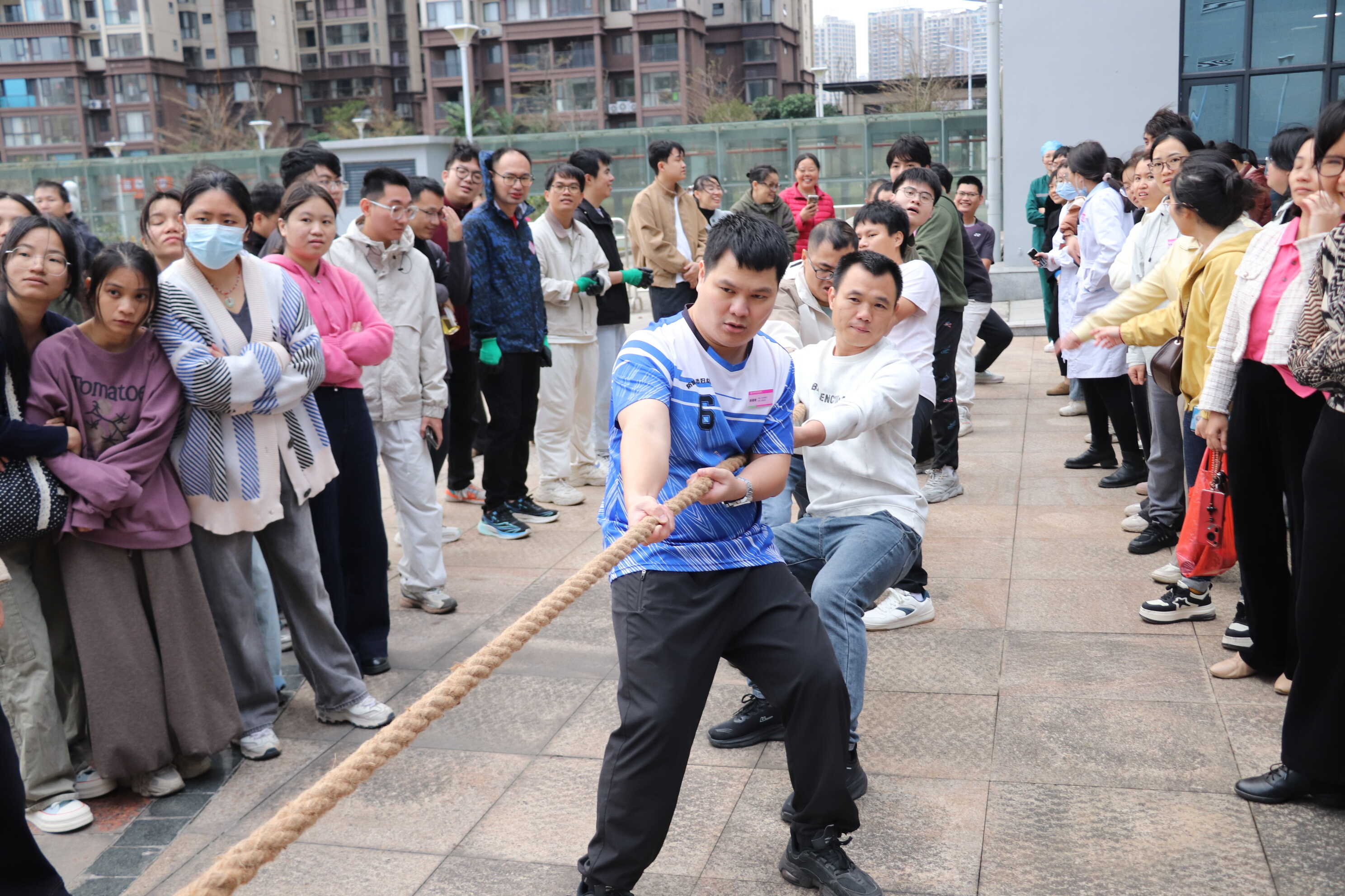 活动现场人头攒动,欢声笑语交织成一片欢乐的海洋。在夹元宵、趣味抛圈等游戏区,参与者们或屏息凝神,比拼手眼协调,或三五成群,默契配合,脸上洋溢着灿烂的笑容。在“妙手夹元宵”环节中,医护人员将日常工作中练就的“针线活”发挥得淋漓尽致——眼疾手快、稳准并重,引来阵阵喝彩。最引人瞩目的当属拔河比赛,随着哨声响起,女子8支队伍与男子4支队伍轮番上阵,展开激烈角逐。平日里身着白大褂、温柔耐心的女医生女护士们,此刻化身赛场上的“铿锵玫瑰”,队员们紧握长绳、齐心协力,场边的啦啦队呐喊助威声此起彼伏,将整个活动推向了最高潮,充分展现了妇幼人顽强拼搏、团结奋进的精神风貌。