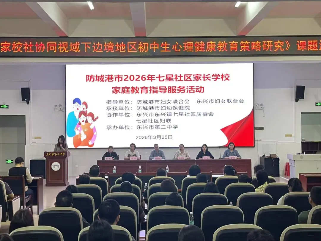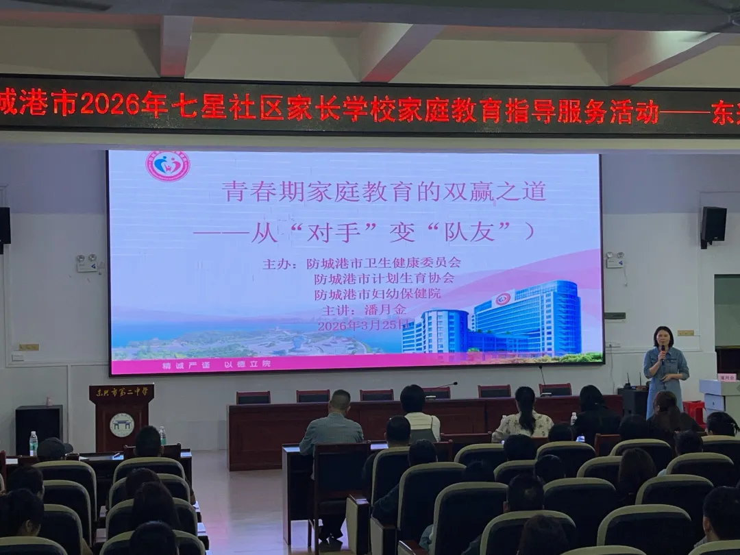 3月25日晚,在防城港市妇女联合会的指导下,防城港市妇幼保健院心理团队联合东兴市妇女联合会、东兴市东兴镇七星社区家长学校走进东兴市第二中学开展家庭教育指导服务活动,活动以专题讲座和“一对一”家庭个案辅导的形式开展。