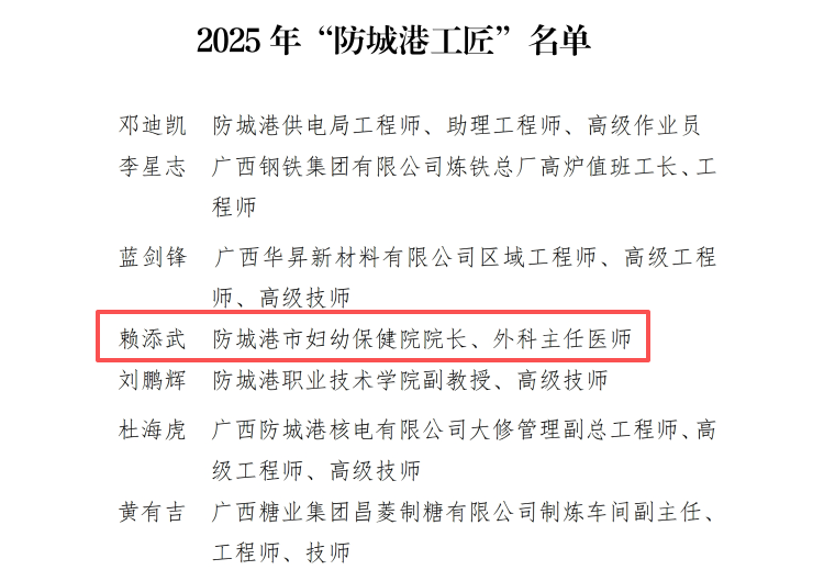 匠心仁术守健康!防城港市妇幼保健院党委副书记、院长赖添武获评2025年“防城港工匠”称号