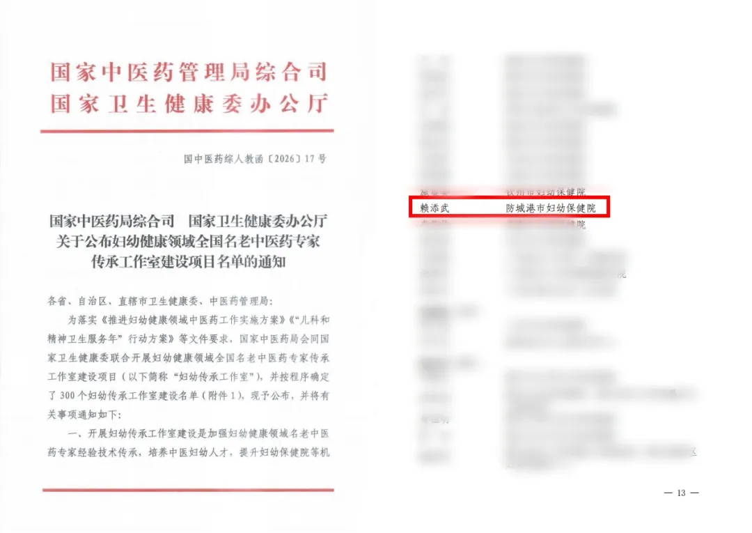 近日,国家中医药管理局综合司、国家卫生健康委办公厅联合印发《关于公布妇幼健康领域全国名老中医药专家传承工作室建设项目名单的通知》,市妇幼保健院“妇幼健康领域全国名老中医药专家传承工作室(赖添武)”建设项目成功获批。这一“国”字殊荣,是对我院“中医进妇幼”工作成效的充分肯定,也是我院坚持中医药特色发展迈出的重要一步。