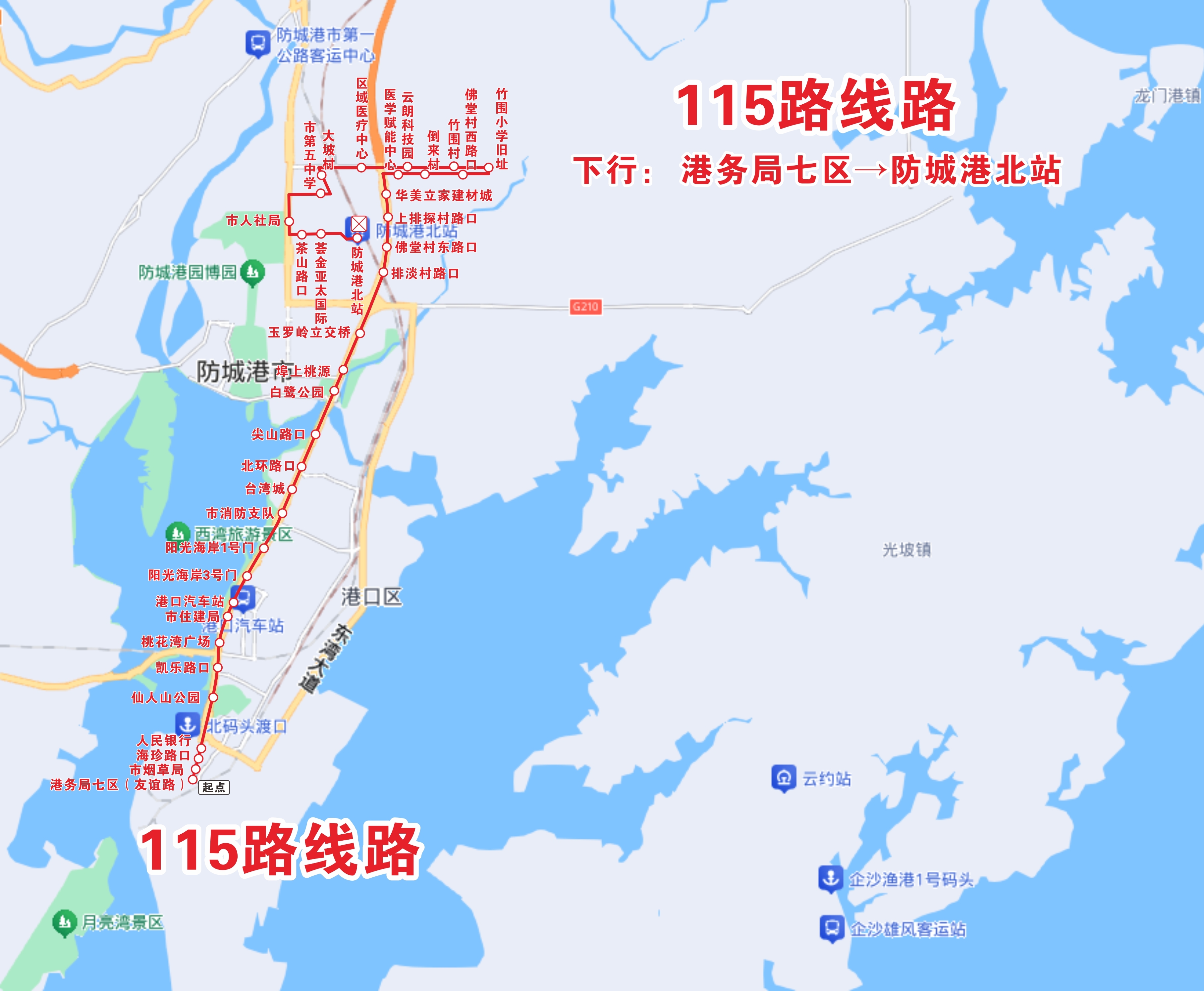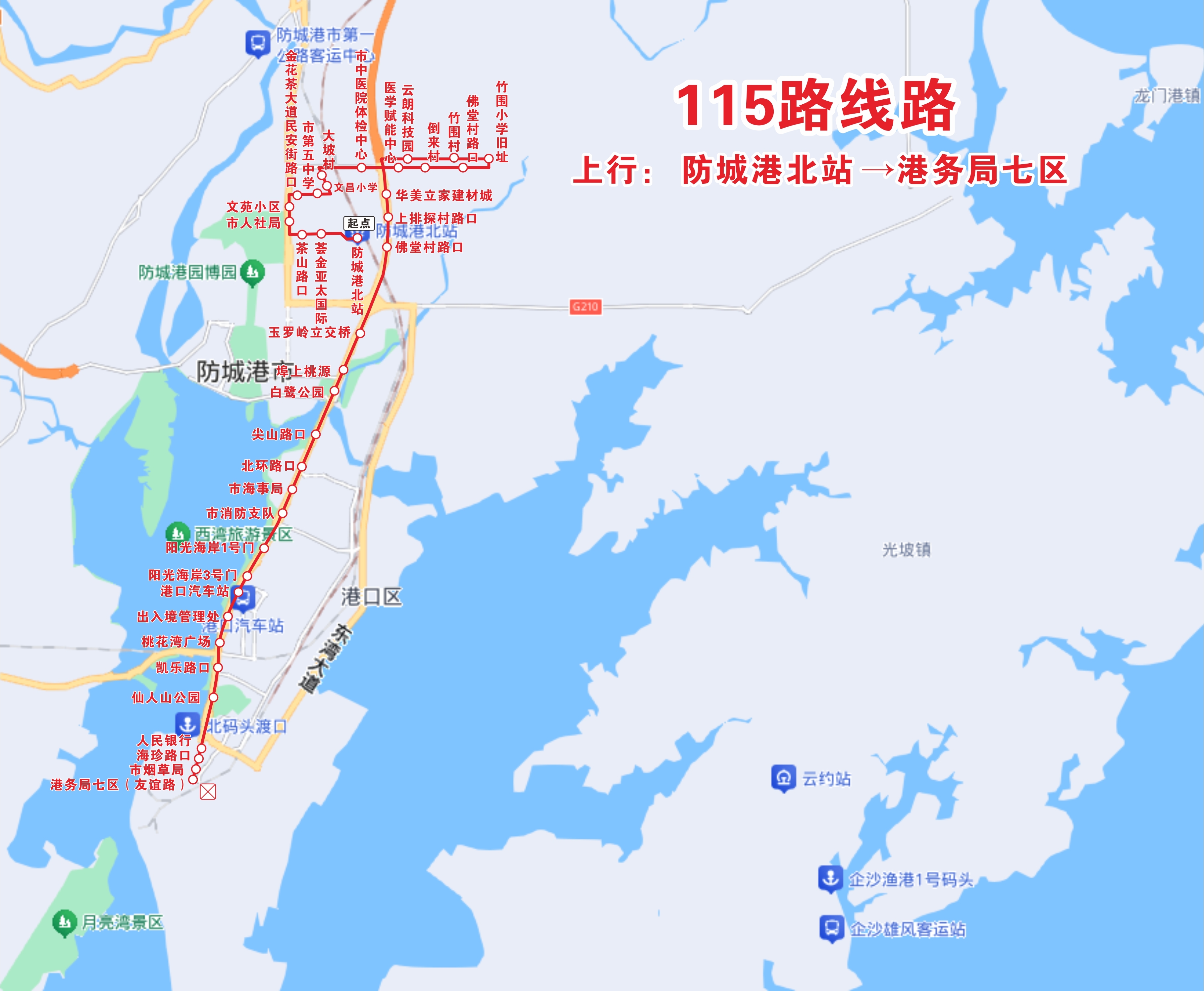 | 115路 | 港务局七区(友谊路)—防城港北站:6:40-18:35 防城港北站—港务局七区(友谊路):7:50—22:20 |