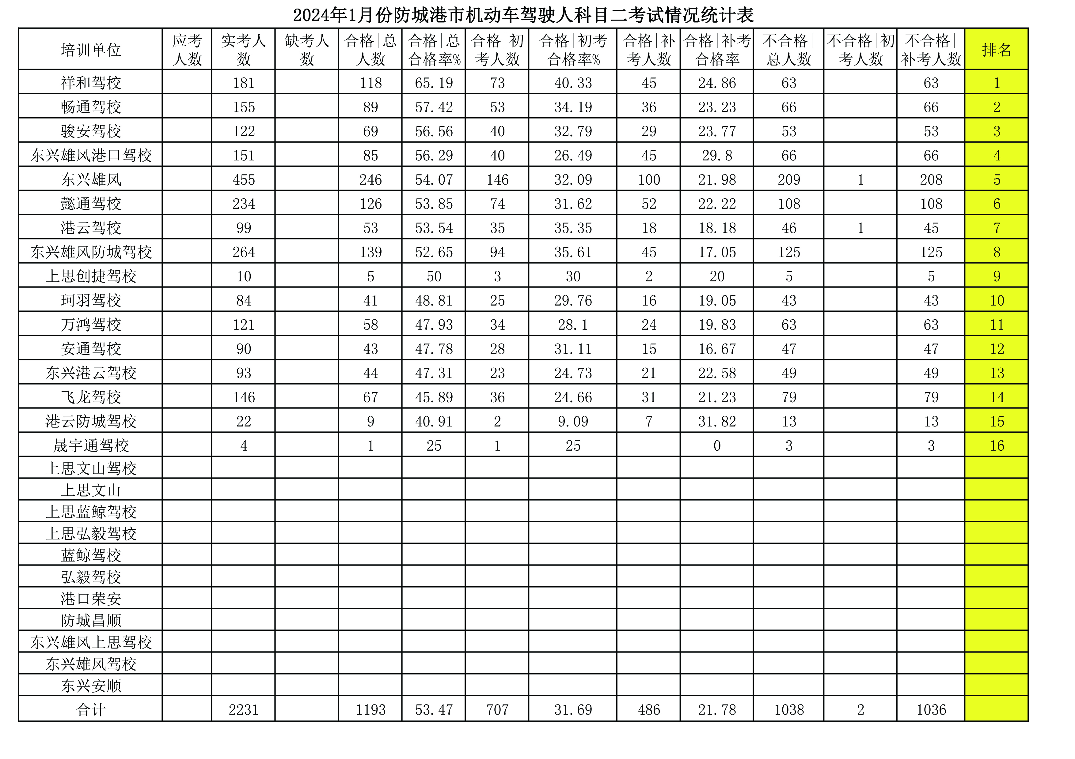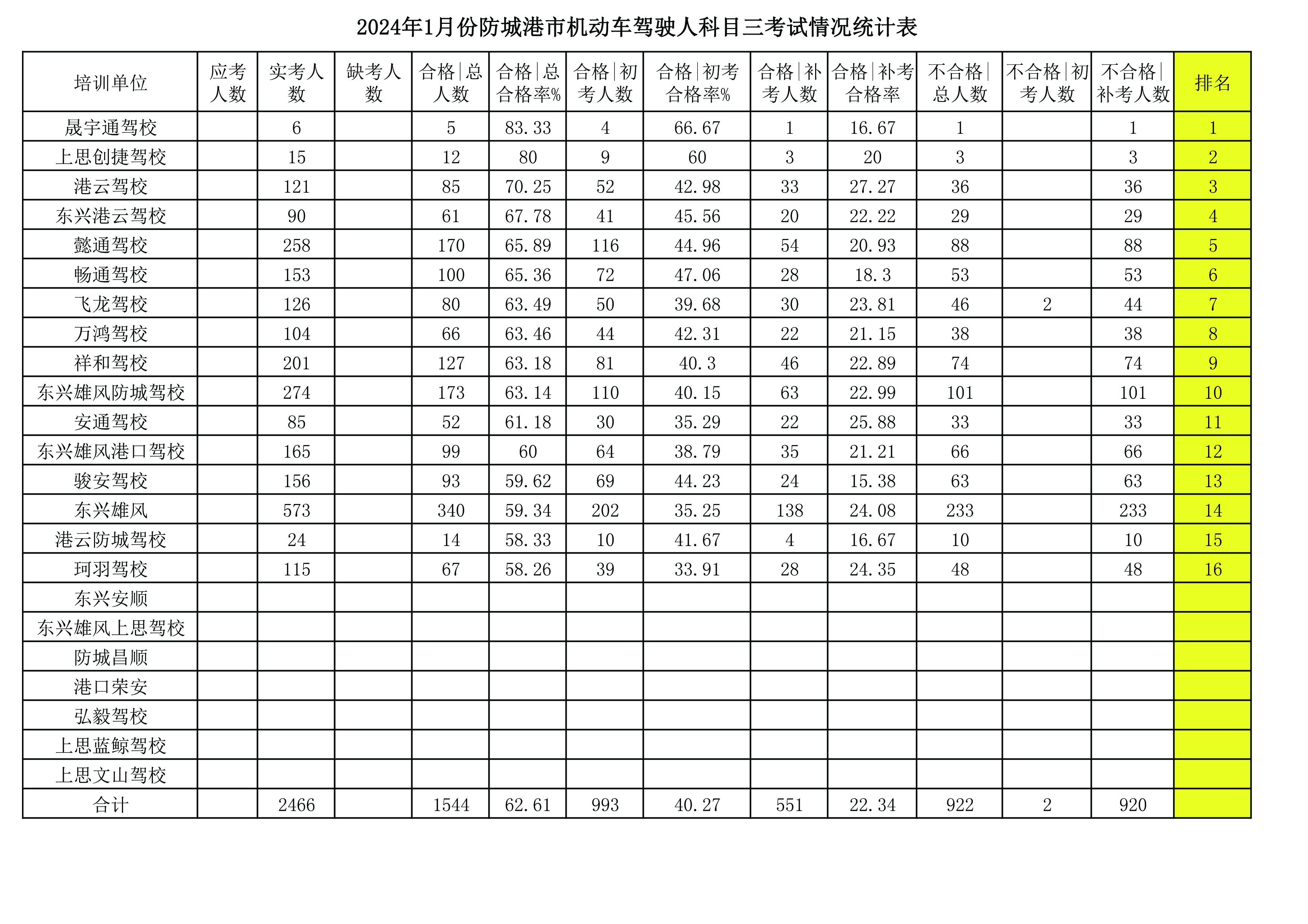 2024年1月份防城港市机动车驾驶人科目二、科目三考试情况统计表