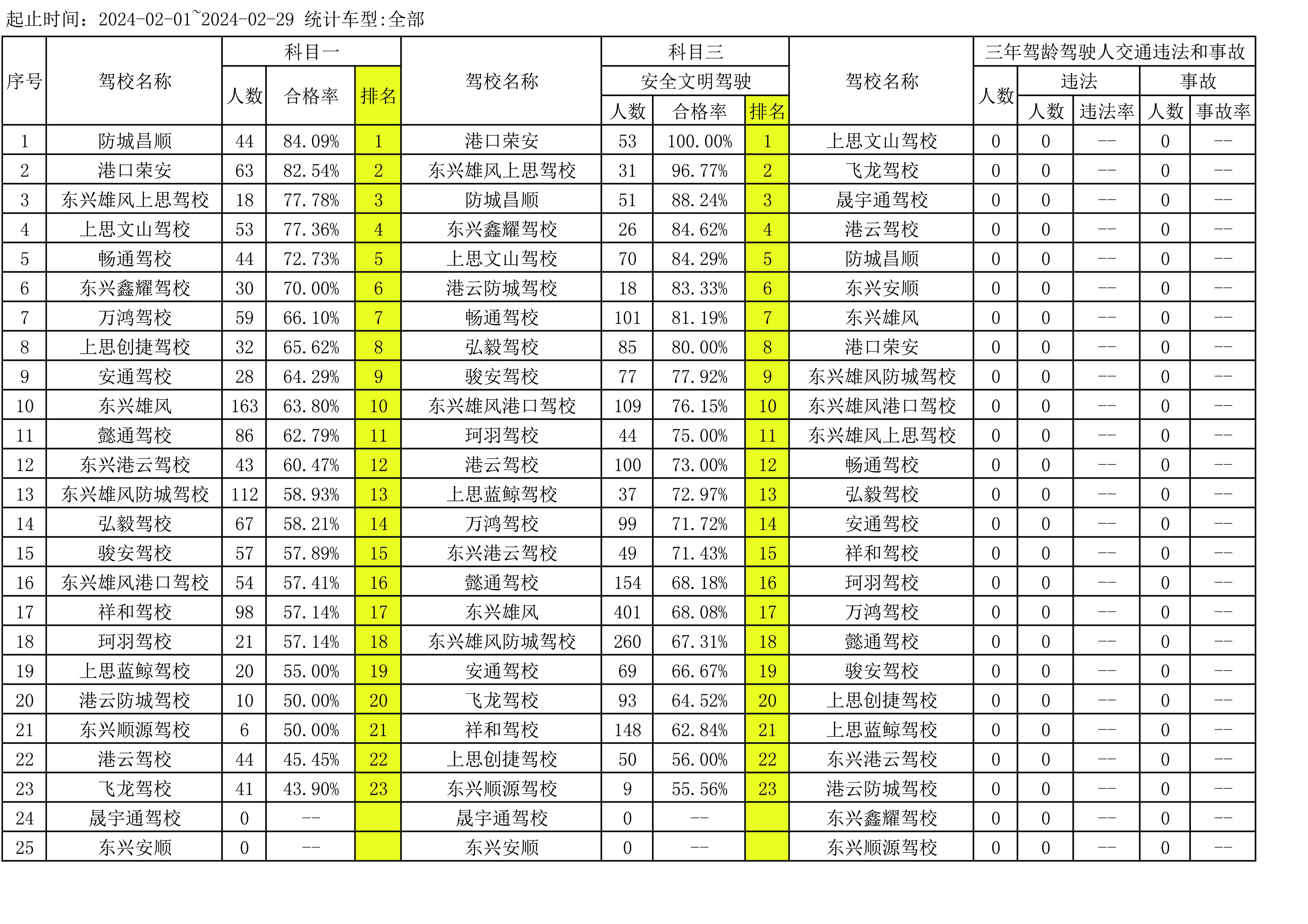 2024年2月份防城港市各驾校科目一、文明常识培训质量统计和三年驾龄驾驶人交通违法和事故情况