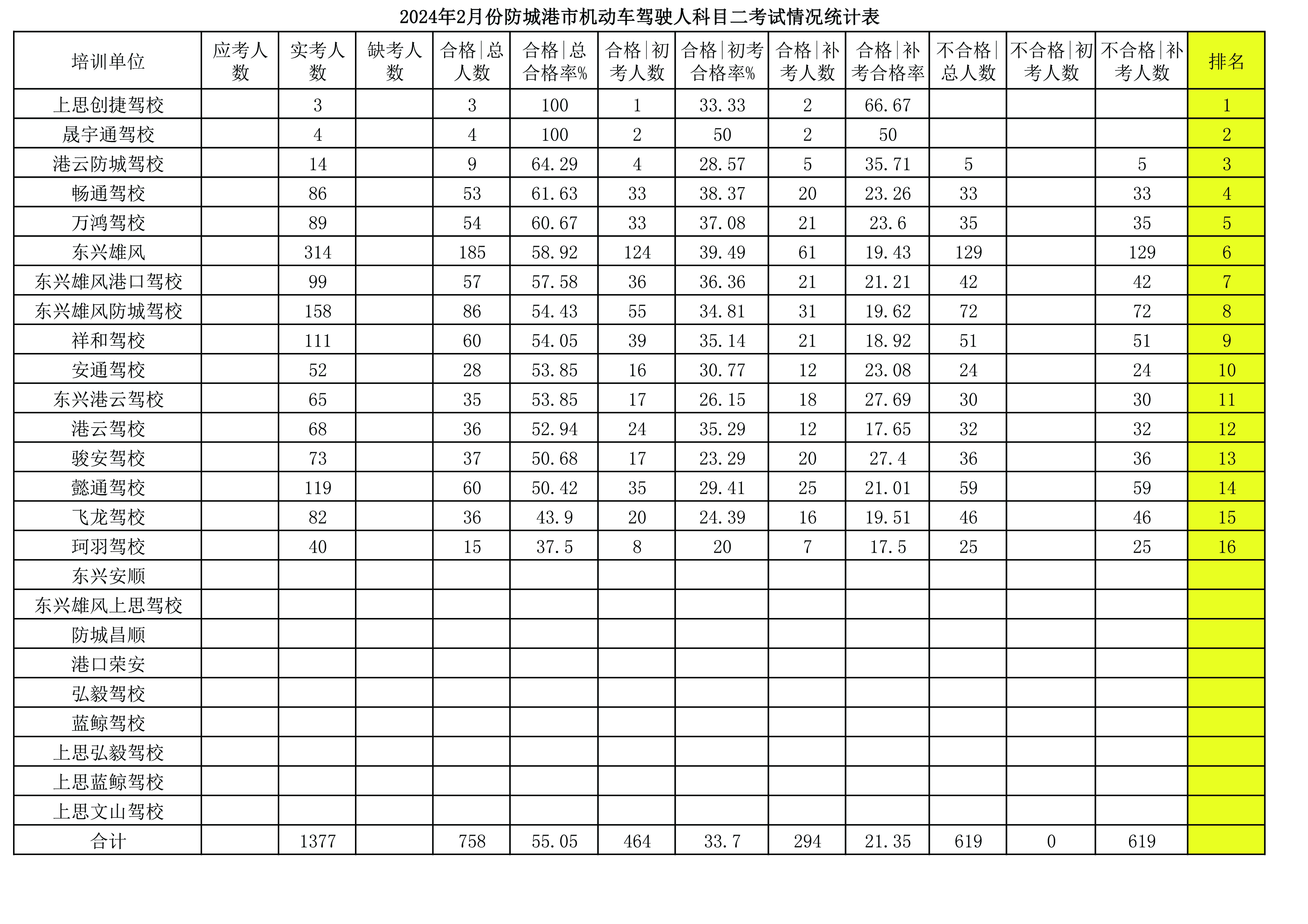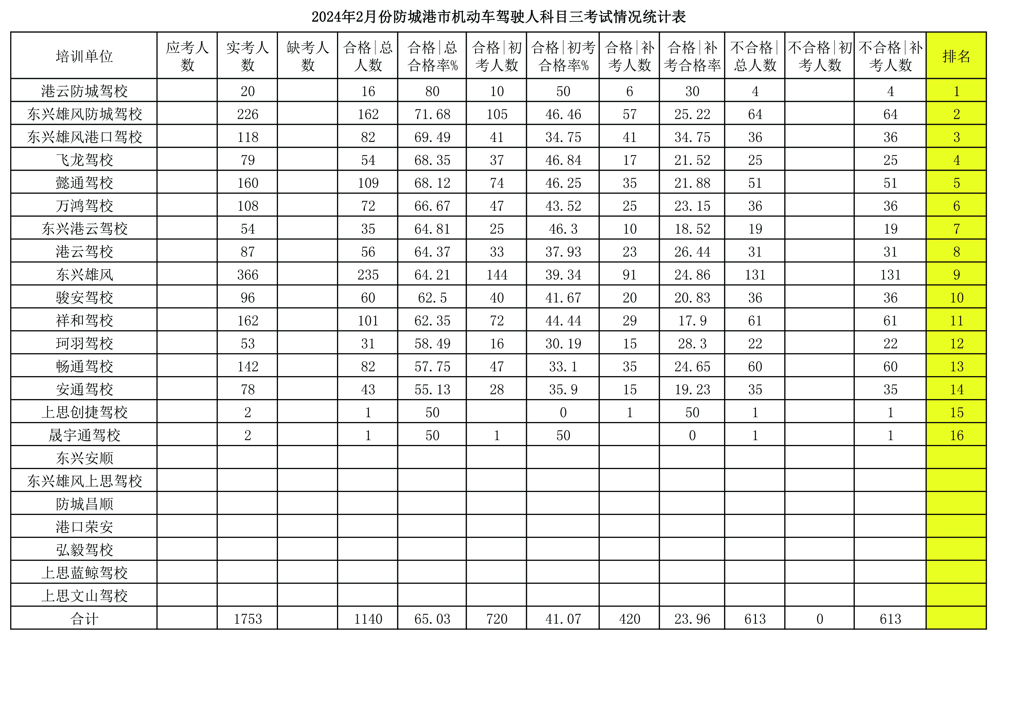 2024年2月份防城港市机动车驾驶人科目二、科目三考试情况统计表