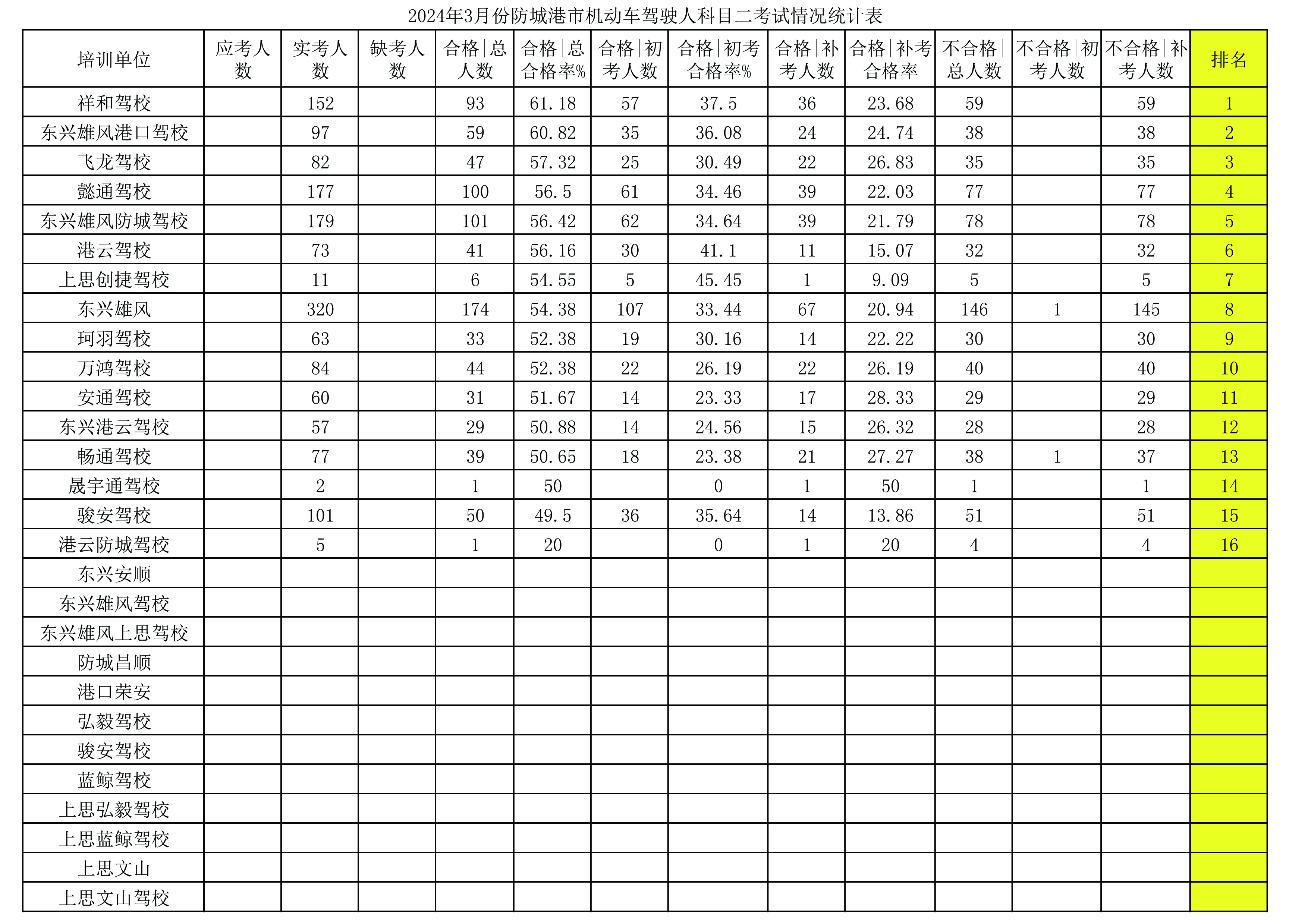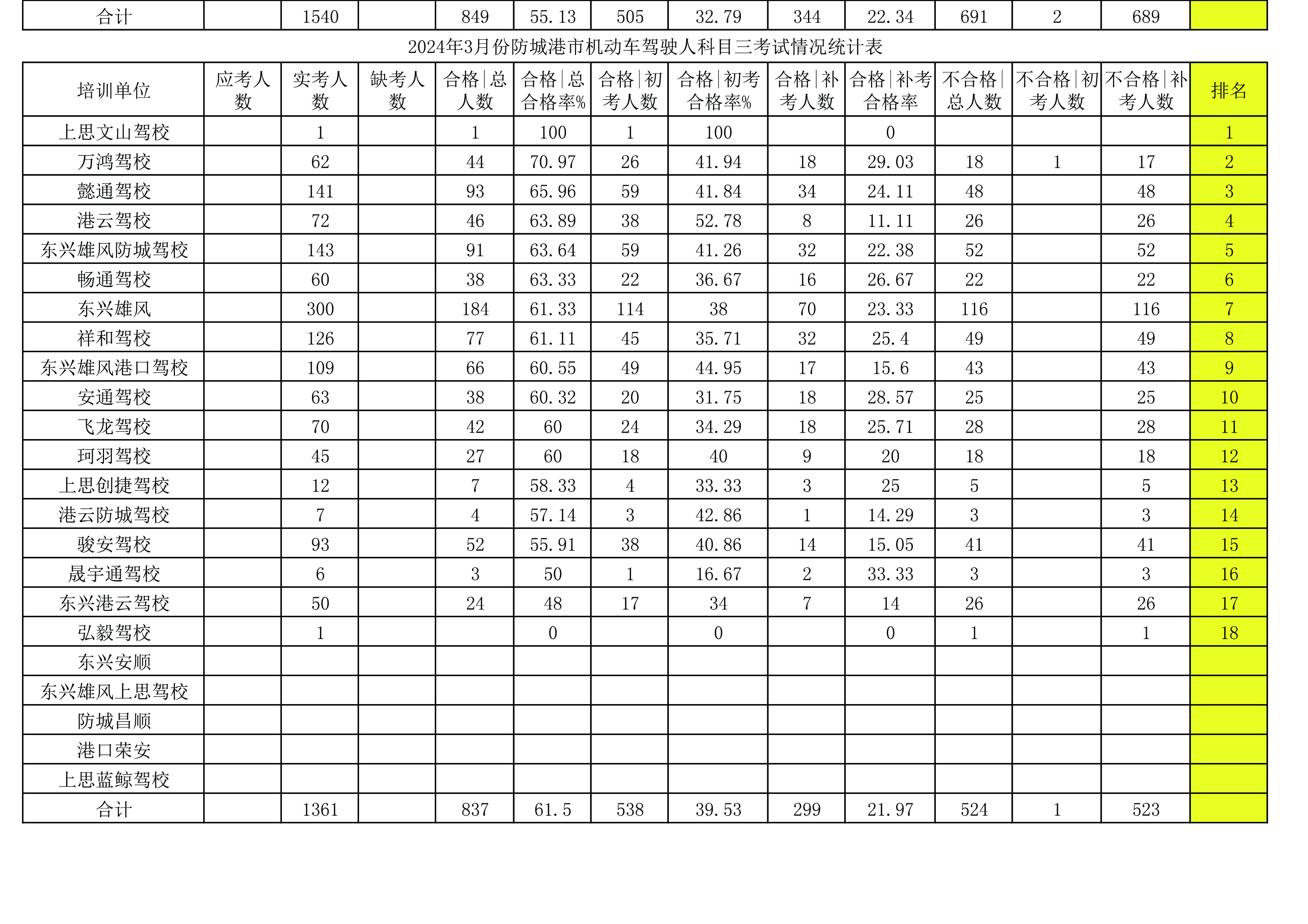 2024年3月份防城港市机动车驾驶人科目二、科目三考试情况统计表
