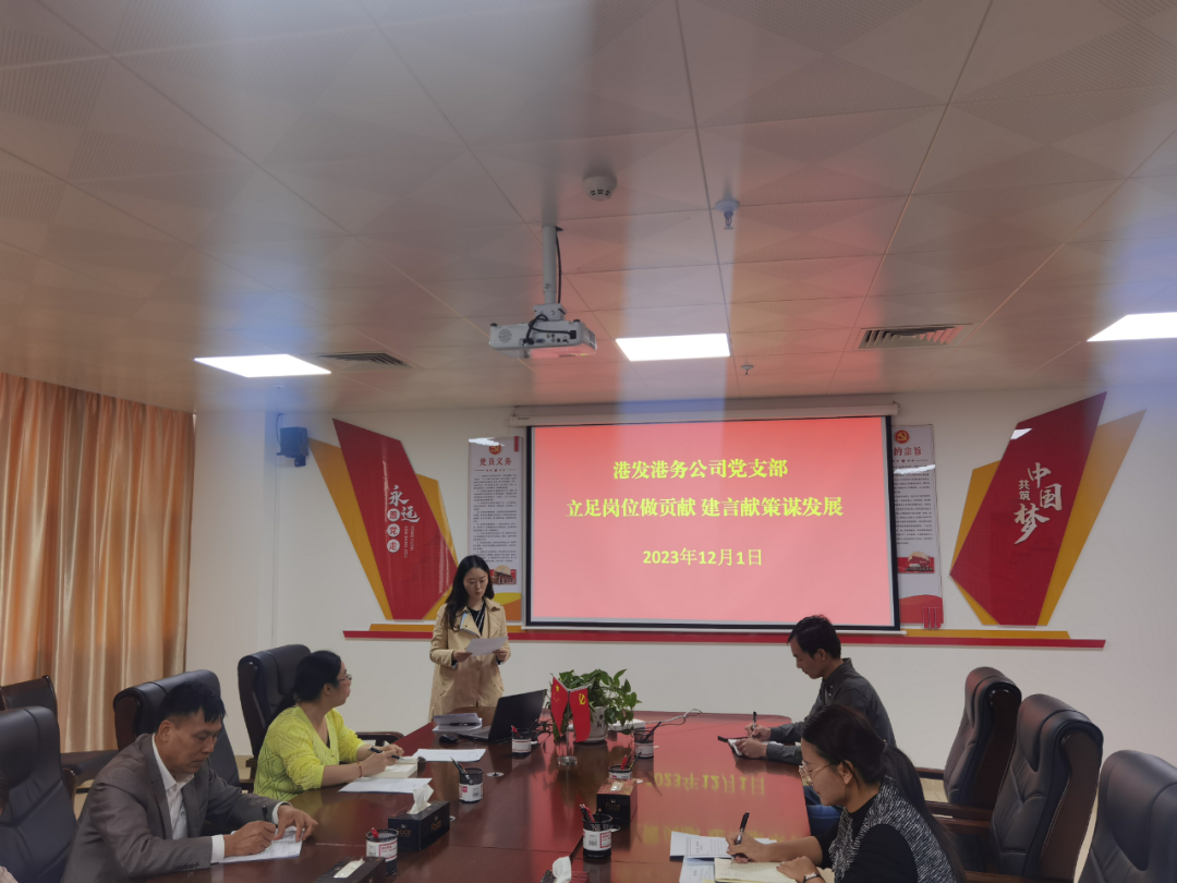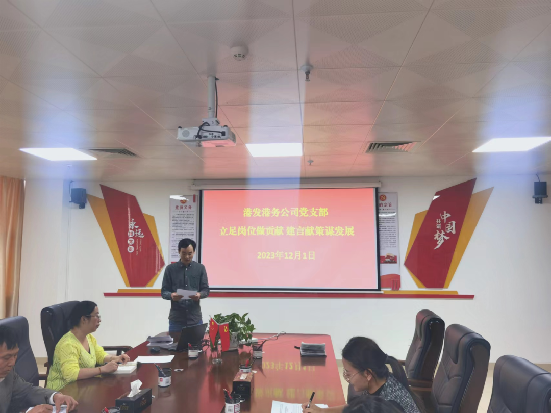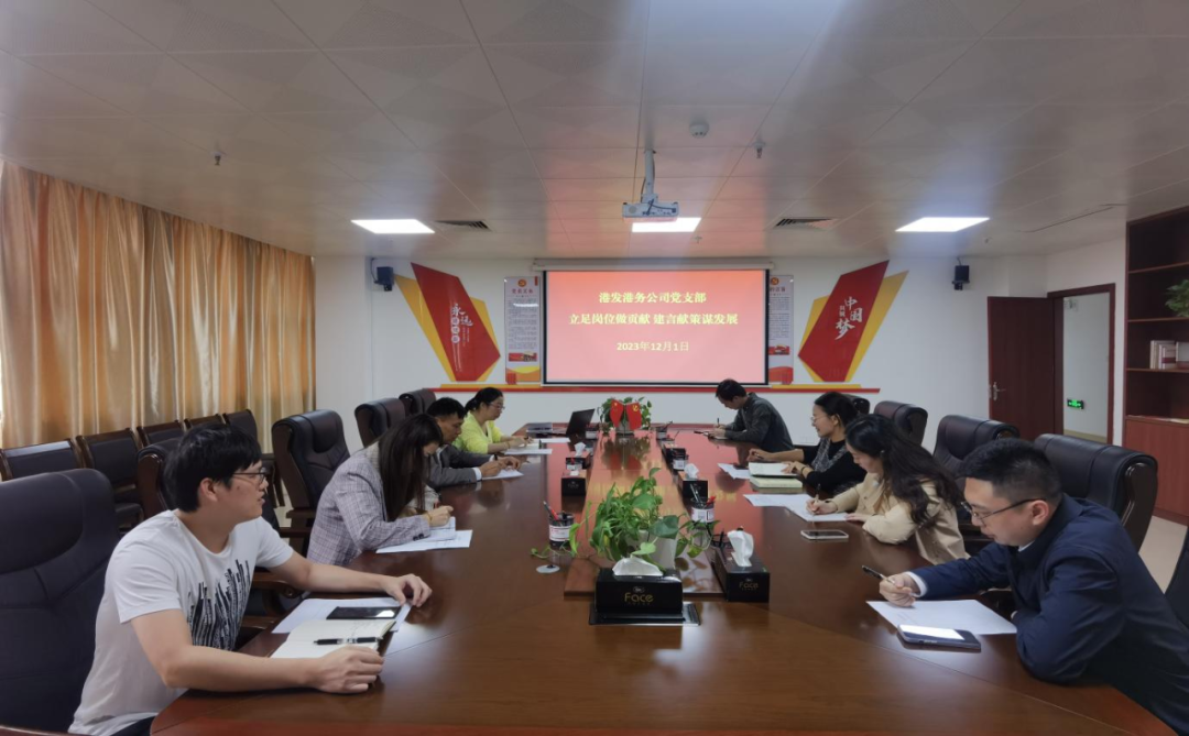 为深入学习贯彻习近平新时代中国特色社会主义思想,全面贯彻落实党的二十大精神,聚焦“学思想、强党性、重实践、建新功”的总要求,集思广益、凝心聚力,2023年12月1日上午,港发港务公司党支部组织全体党员和职工代表等9人开展“立足岗位作贡献 建言献策谋发展”主题党日活动。