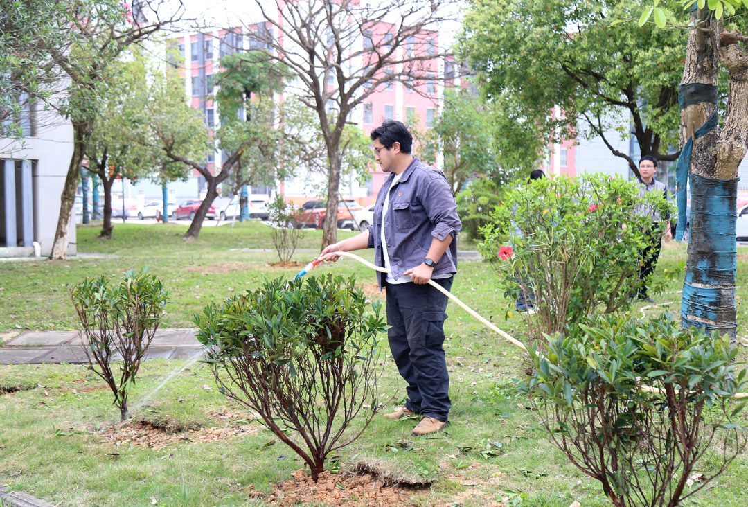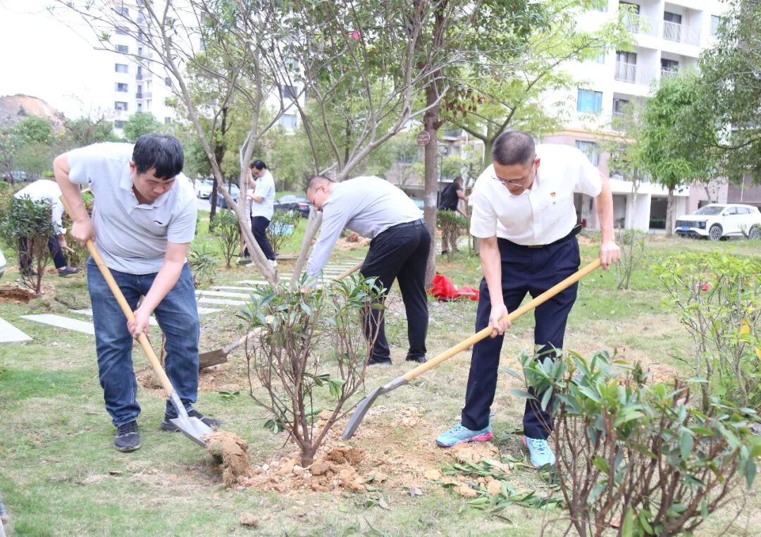 活动现场,党员干部们热情高涨、干劲十足,他们两人或三人一组,有的挥锄铲土、有的扶苗填坑、有的浇水固根,呈现出一派热火朝天的劳动景象。在大家的共同努力下,一株株承载绿色希望的新苗迎风挺立、错落有致,为园区增添了勃勃生机与盎然绿意。