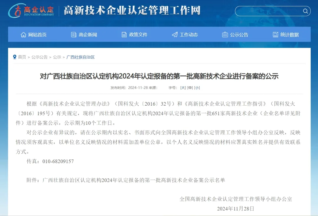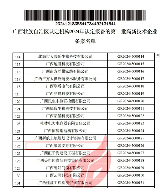 近日,高新技术企业认定管理工作网发布了对广西壮族自治区认定机构2024年认定报备的第一批高新技术企业备案公示名单,广西聚馨麦芽有限公司荣列其中,并成功通过高新技术企业审核认定,正式迈入国家高新技术企业行列,开启新篇章。