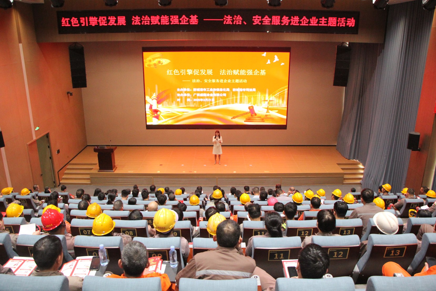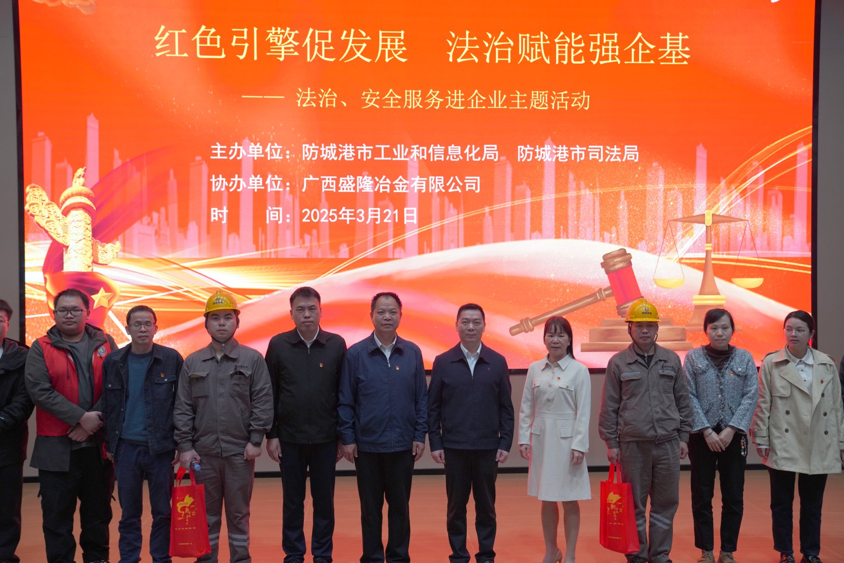 3月21日上午,市工信局与市司法局携手,走进广西盛隆冶金有限公司开展了一场以“红色引擎促发展 法治赋能强企基”为主题的法治、安全服务进企业活动。此次活动以党建为引领,积极推动法治宣传与安全生产的深度融合,为企业高质量发展注入强劲动力。市工信局党组成员、副局长谢君林,市司法局党组成员、政治部主任吕远程带队,市工信局、市司法局、港口区工信局、防城区工信局党员干部以及我市部分重点工业企业员工代表近200人参加了本次活动。