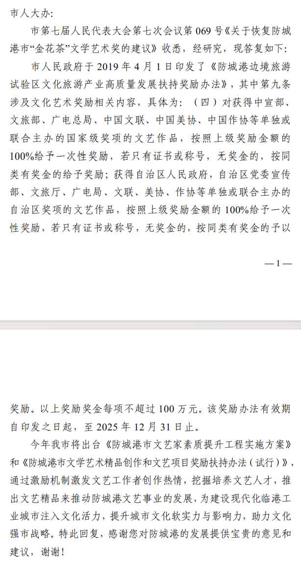 对防城港市七届七次会议第69号建议的答复