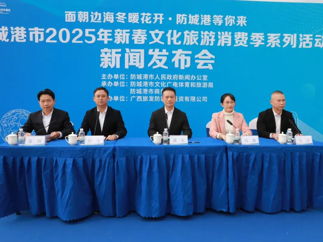防城港市人民政府新闻办公室于2025年1月16日(星期四)上午11:00,在防城港市白沙湾举行“面朝边海冬暖花开·防城港等你来”防城港市2025年新春文化旅游消费季系列活动新闻发布会,邀请防城港市人民政府副市长禤东;防城港市文化广电体育和旅游局局长冯慧;市商务局局长经立;东兴市人民政府副市长马力,介绍防城港市2025年新春文化旅游消费季系列活动情况并回答记者提问。发布会由防城港市委宣传部副部长(兼)、市互联网信息办公室主任蓝剑主持。
