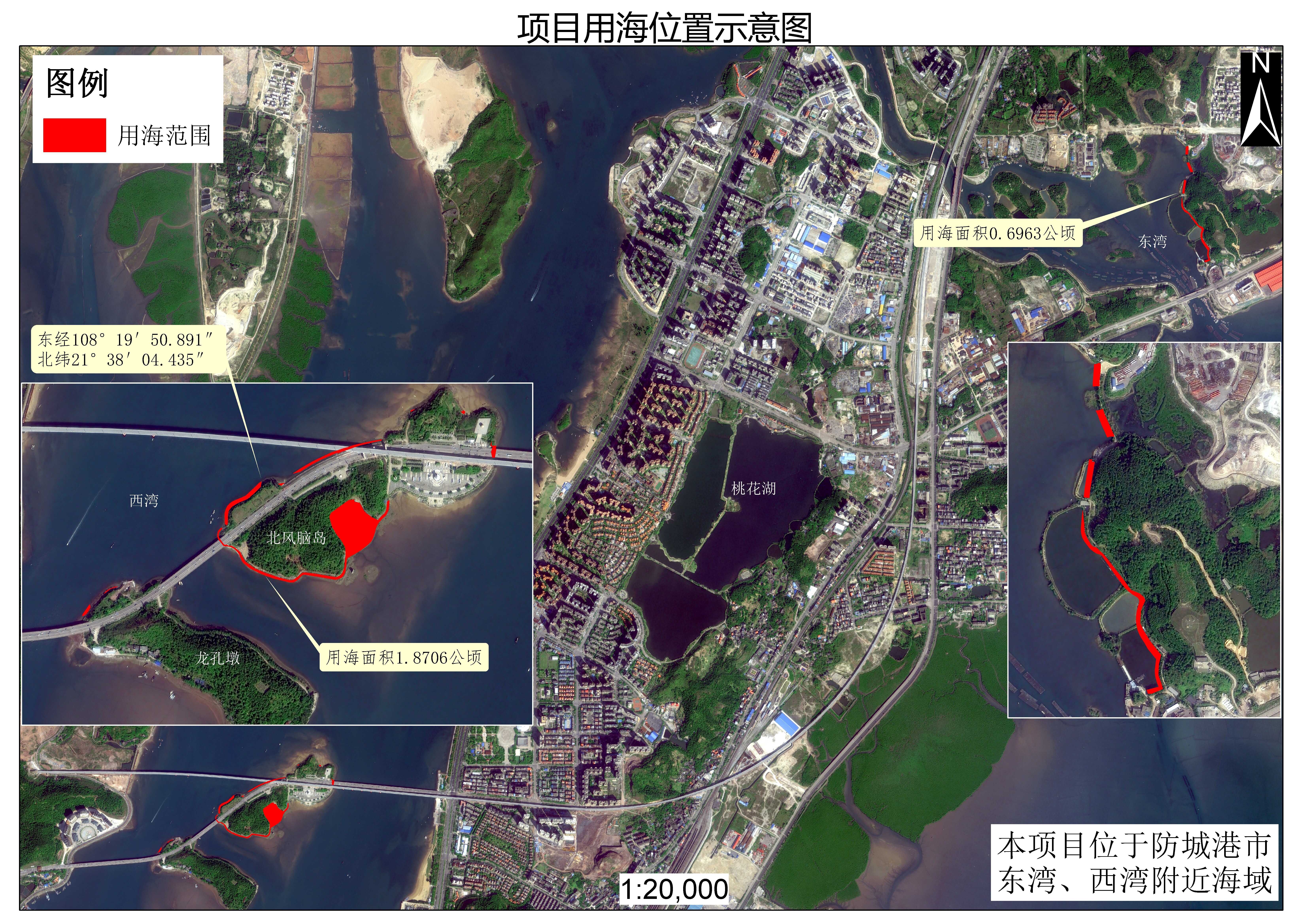 防城港市文旅集团有限公司拟申请防城港市西湾、东湾毗邻海域(位置坐标为:108°19′50.891"E,21°38′04.435"N),用海性质为公益性事业用海,用海类型为特殊用海,用海方式为构筑物用海、围海用海,项目用海总面积为2.5669公顷(最终以海域使用论证通过的面积为准),其中非透水构筑物用海0.8618公顷,透水构筑物用海0.2790公顷,其他围海用海0.7078公顷,申请用海期限40年;施工期用海0.7183公顷,用海方式为非透水构筑物用海,申请用海期限2年。根据《中华人民共和国海域使用管理法》等有关规定,现将该项目用海情况予以公示,如有异议,请在公示之日起二十日内向我局提出书面意见。如无异议或异议不成立,将按有关规定办理用海手续。