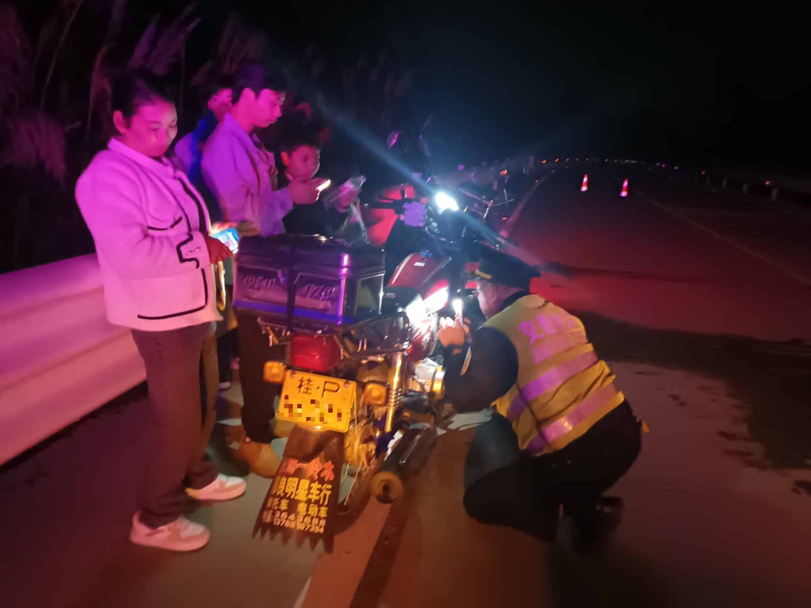 经询问得知,驾驶员因摩托车燃油耗尽被迫停靠,其弟专程赶来送油,却因加油站夜间关门未能补充足量燃油,且不懂抽油操作,姐弟俩一时陷入两难。工作组人员首先严肃指出了他们未设置警示标志的严重安全隐患:“夜间视线差,行车道边缘停车无警示标识,相当于把自己和他人置于危险之中,一旦发生事故后果不堪设想。”