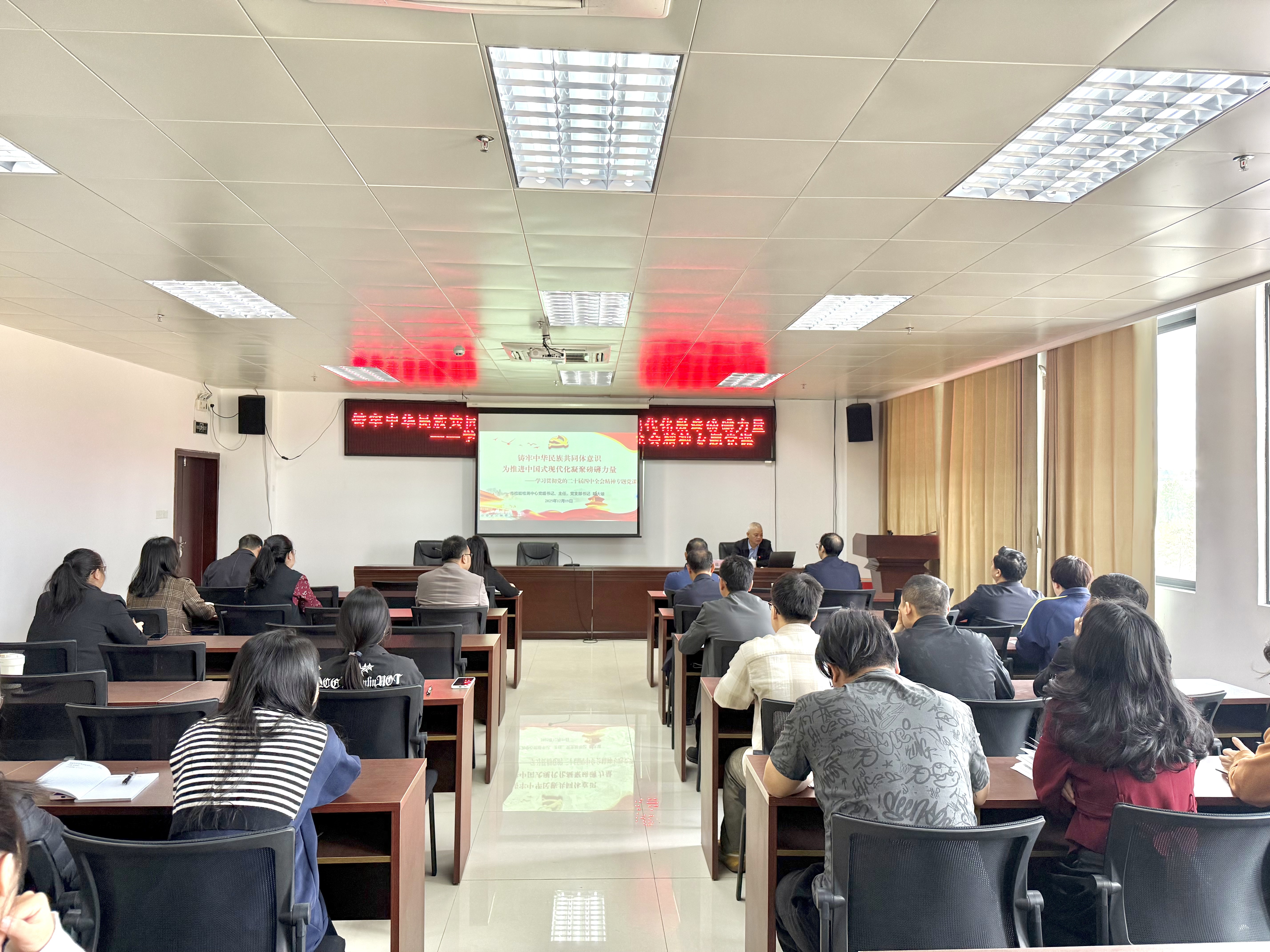 为深入学习贯彻党的二十届四中全会精神,切实把思想和行动统一到党中央关于铸牢中华民族共同体意识的重大部署上来,近日,防城港市检验检测中心党支部组织开展专题党课学习,以理论滋养初心、以使命凝聚力量,推动全会精神在检验检测一线落地生根。中心领导班子成员及全体干部职工近80人参加了会议。