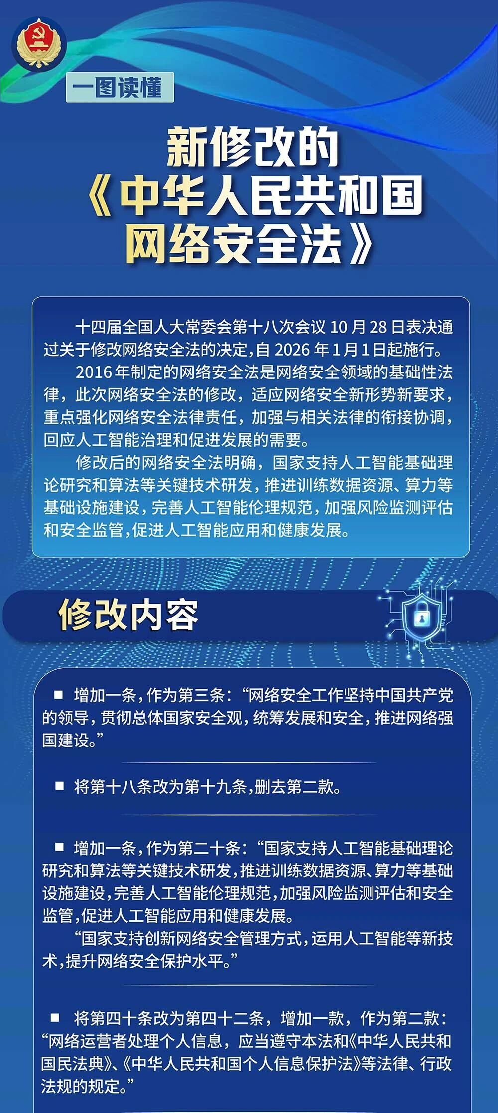 新修改的《中华人民共和国网络安全法》于2026年1月1日起正式实施。这是该法自2017年施行以来的首次重大修改,标志着我国网络安全法治体系迈入“智能时代”新阶段。今天,让我们和小安一同学习新修改的《中华人民共和国网络安全法》有哪些新变化,自觉提升网络风险防范能力,携手筑牢网络安全的坚实防线。