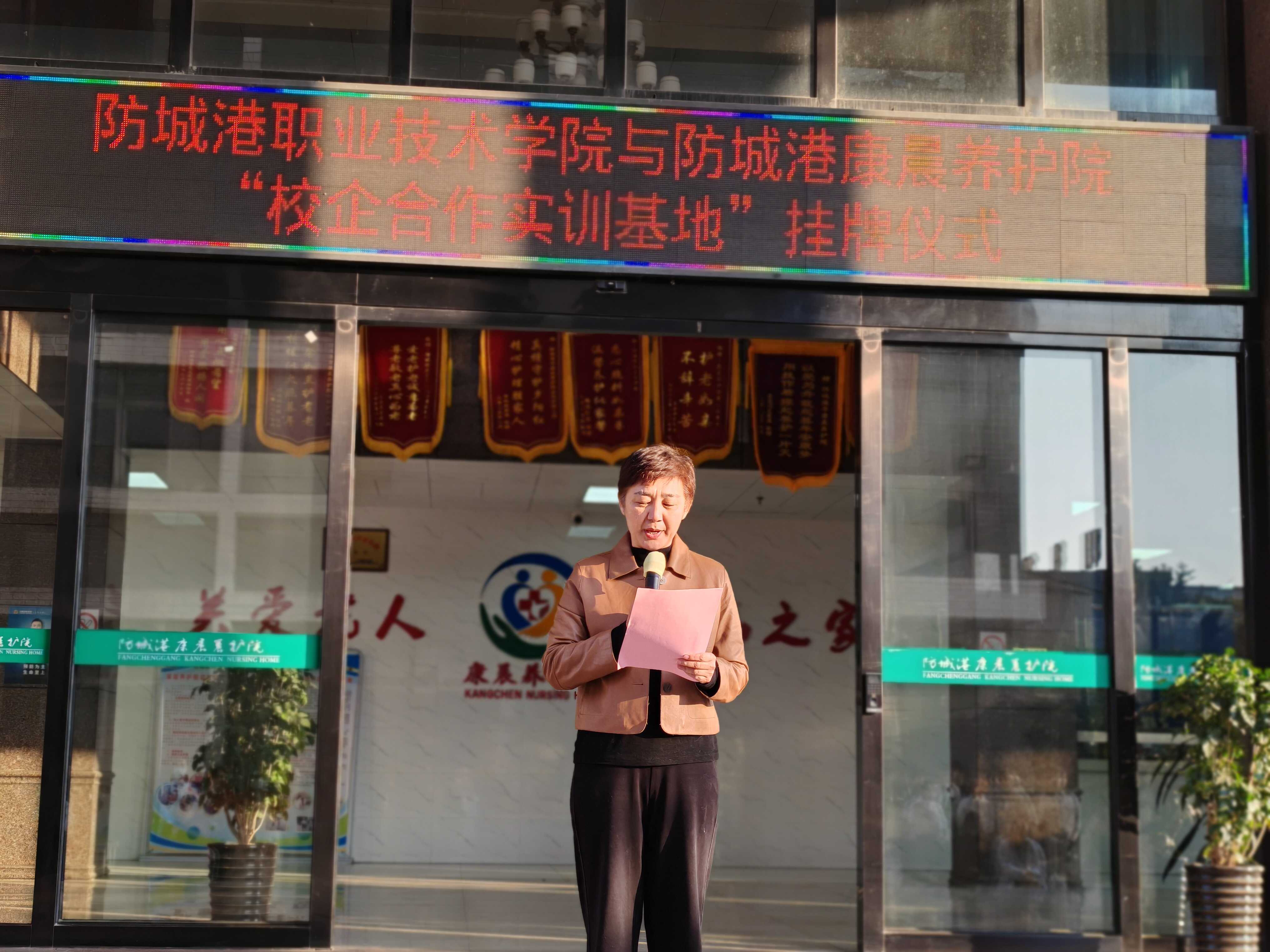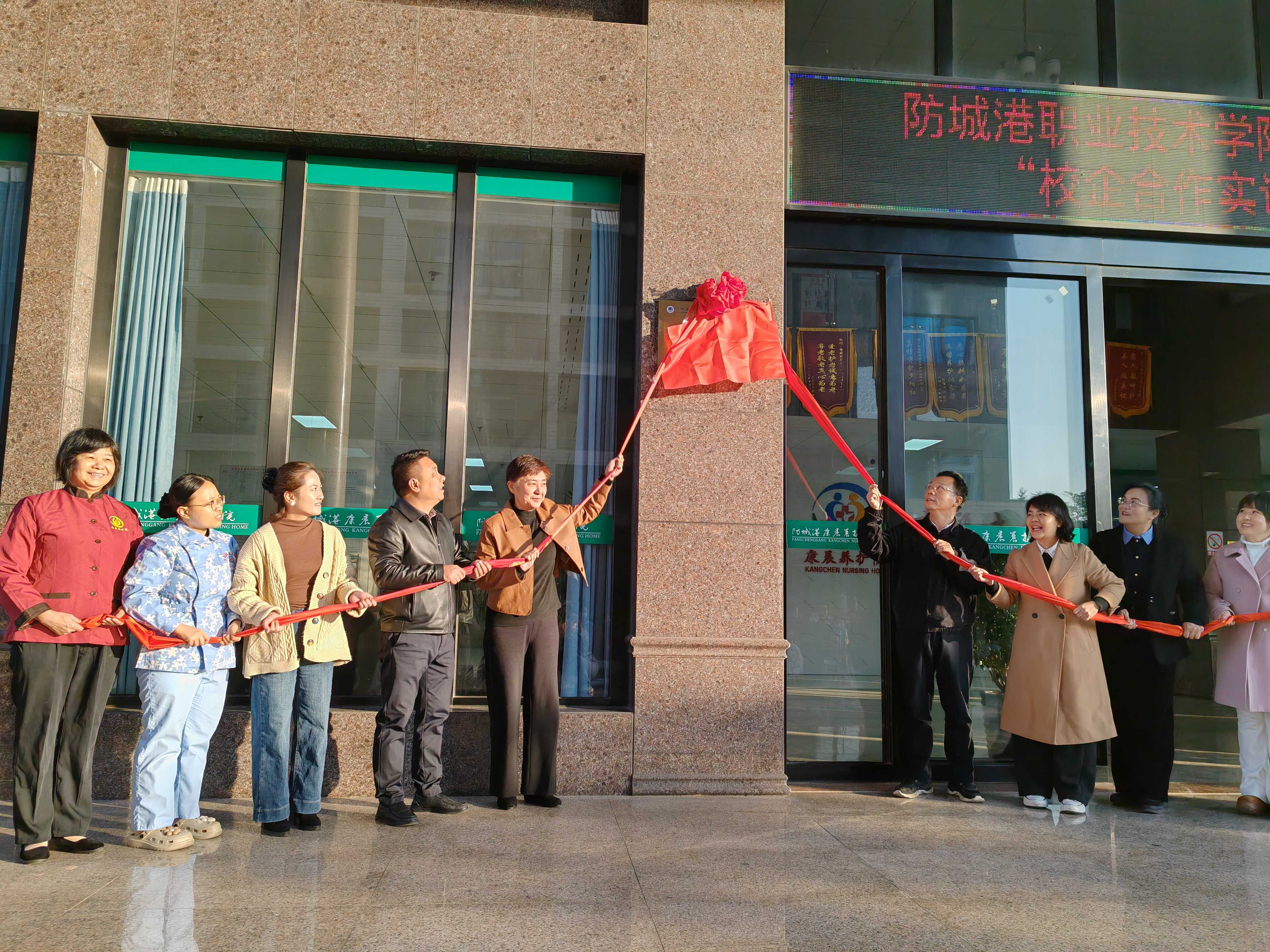 为积极响应国家关于加强职业教育、深化产教融合的号召,推动区域康养服务产业高质量发展,2026年1月9日上午,防城港职业技术学院医药康养学院与防城港康晨养护院校企合作实习实训基地挂牌仪式在防城港康晨养护院隆重举行。市民政局局长李新、防城港职业技术学院校长欧阳群东、防城港康晨养护院院长陈鹏、医药康养学院特聘教授许慧红及师生代表队共同出席了本次活动。