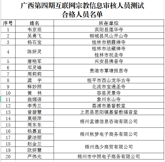广西壮族自治区民族宗教事务委员会关于第四期互联网宗教信息审核人员测试结果的公告