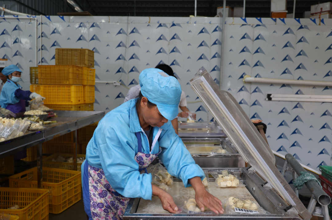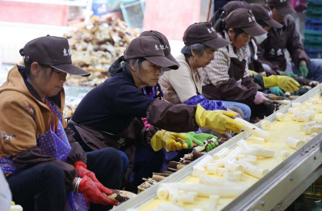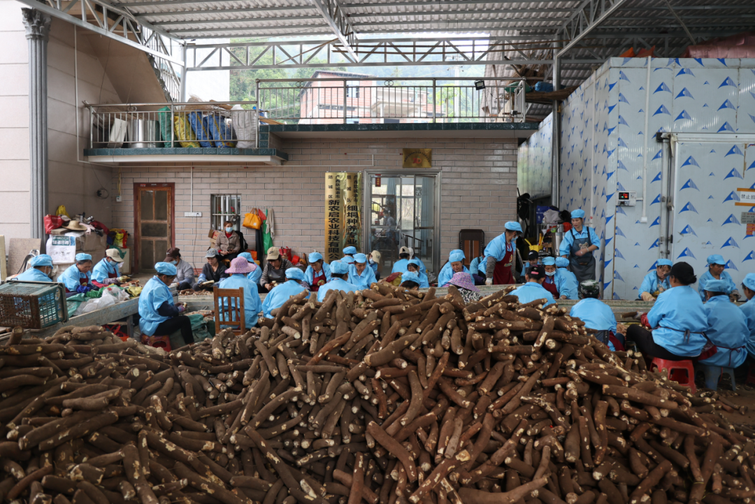 ▲惠农人食用木薯分拣仓储中心内,工人们各司其职对木薯进行处理。