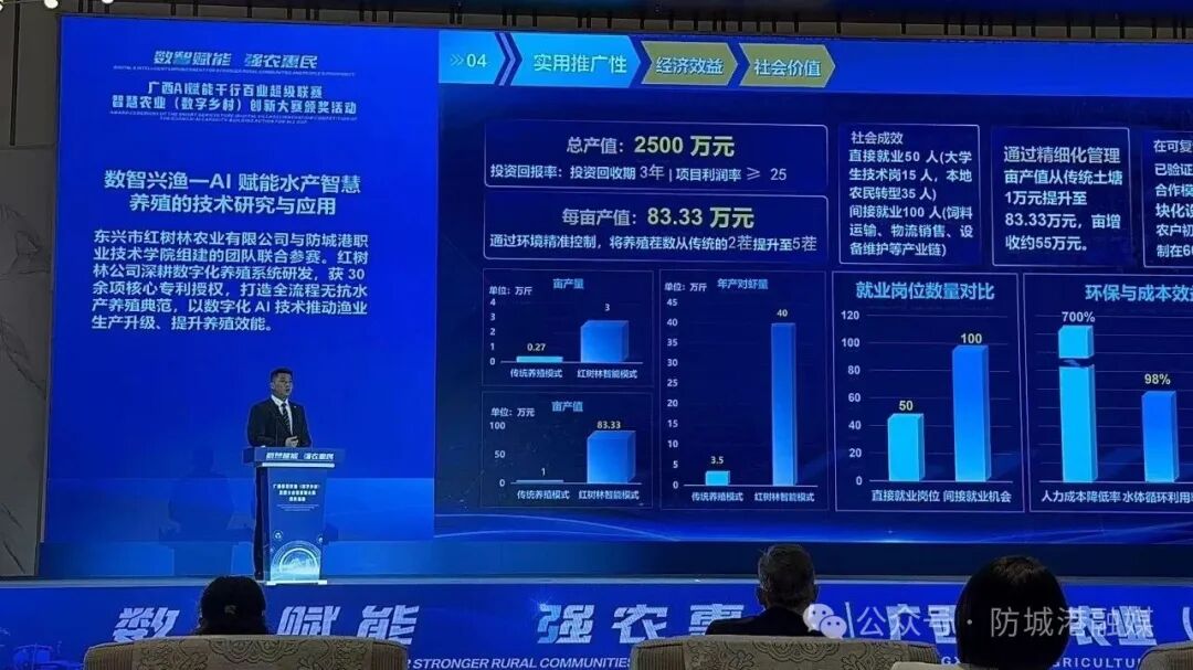 在今年广西智慧农业(数字乡村)创新大赛专业赛道决赛中,红树林农业团队的“数智兴渔——AI赋能水产智慧养殖的技术研究与应用”荣获三等奖,并代表专业赛道组向大赛路演,推介智慧养虾经验。