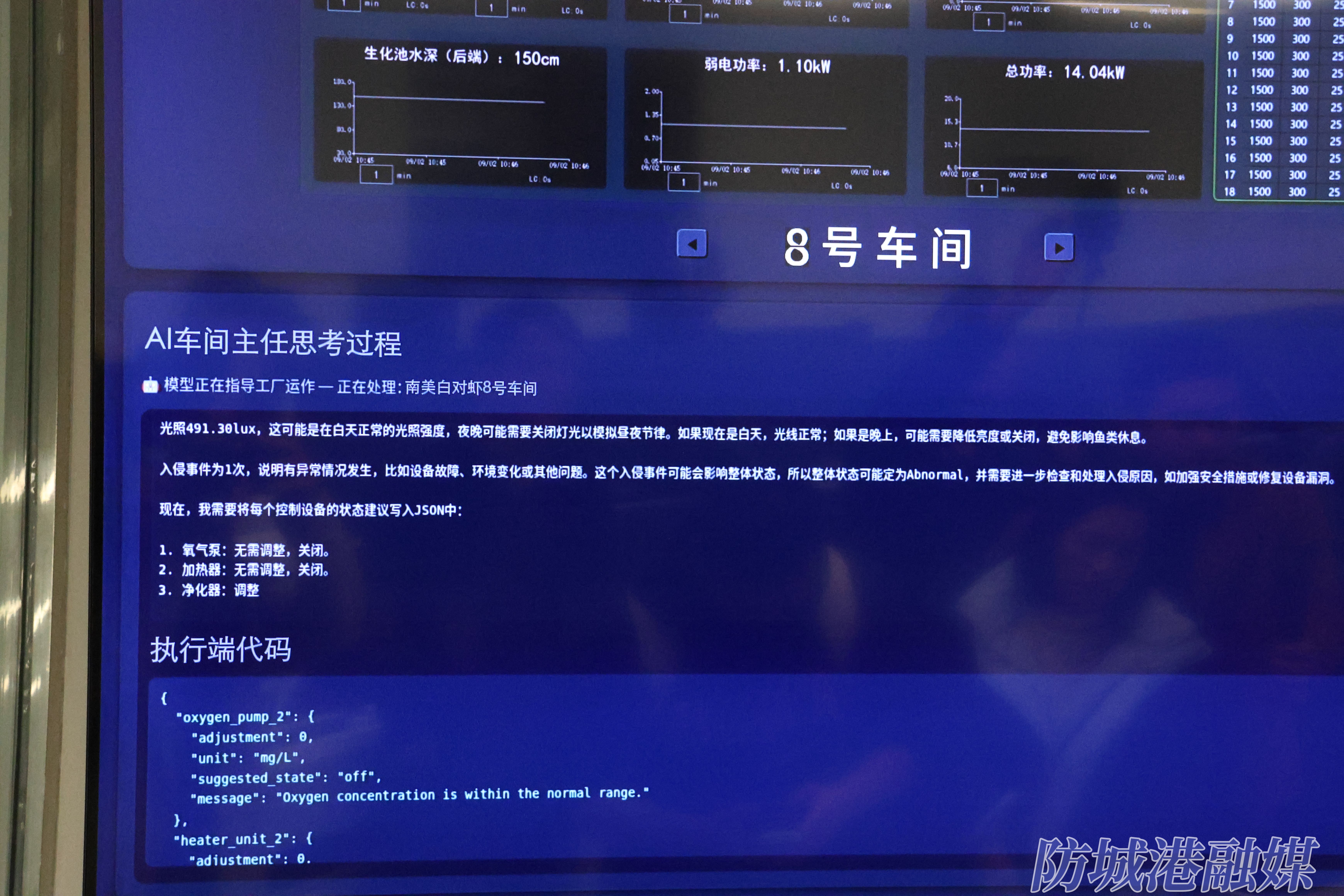 基地负责人侯宗元介绍,目前12个生产车间仅需6名技术人员负责,实现了一人管两个车间的高效模式。2025年9月,基地创新试运行了AI“厂长”,对南美白对虾的喂养、水质监测、尾水处理等环节进行全流程智能化管理。过去,每个技术员要负责多个池子,每天天不亮就开始巡池、测水质、观察虾的吃料情况,工作强度大且容易漏判风险。而AI“厂长”上线后,数据成为养殖决策的依据,让养虾变得更加科学、安心。