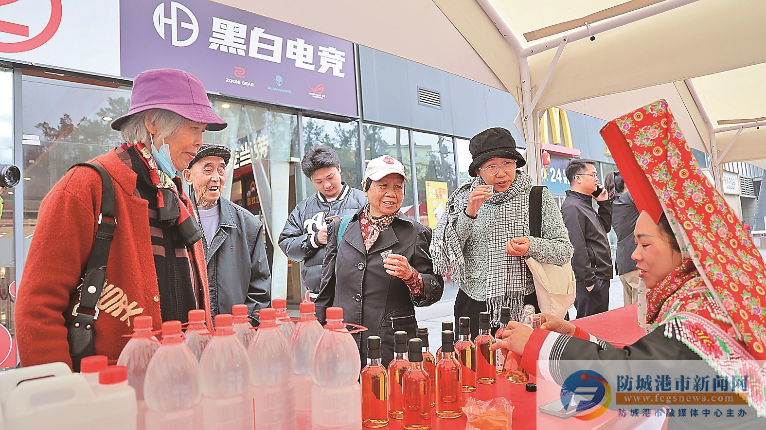 在2026年“暖冬遇见防城港·年货潮集迎新春”年货大集的峒中米酒展位前过往市民群众品尝、购买。