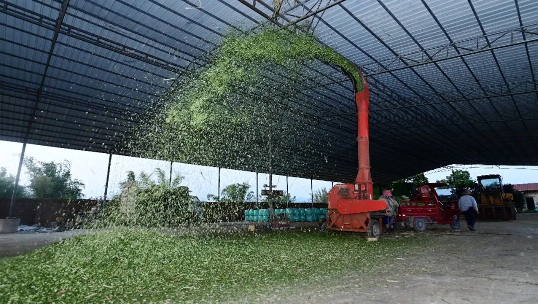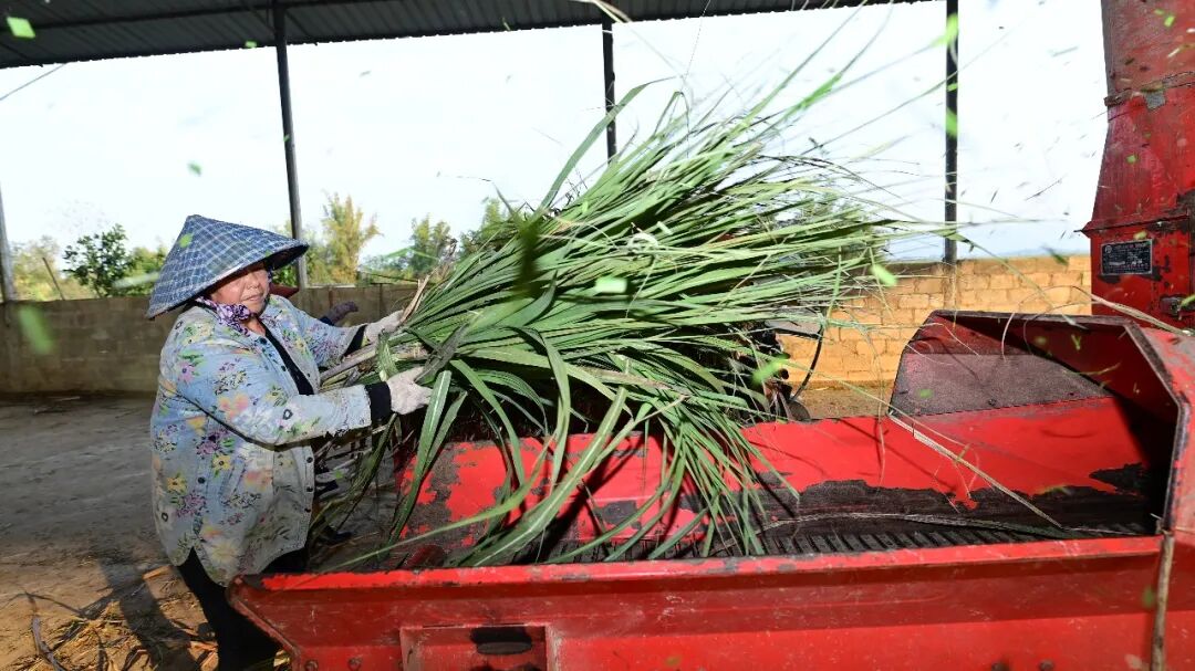 养殖场负责人王飞朝看到了机会。她反复试验,把甘蔗叶破碎、发酵,做成牛饲料。“成本低了,牛爱吃,长得好。”她说。