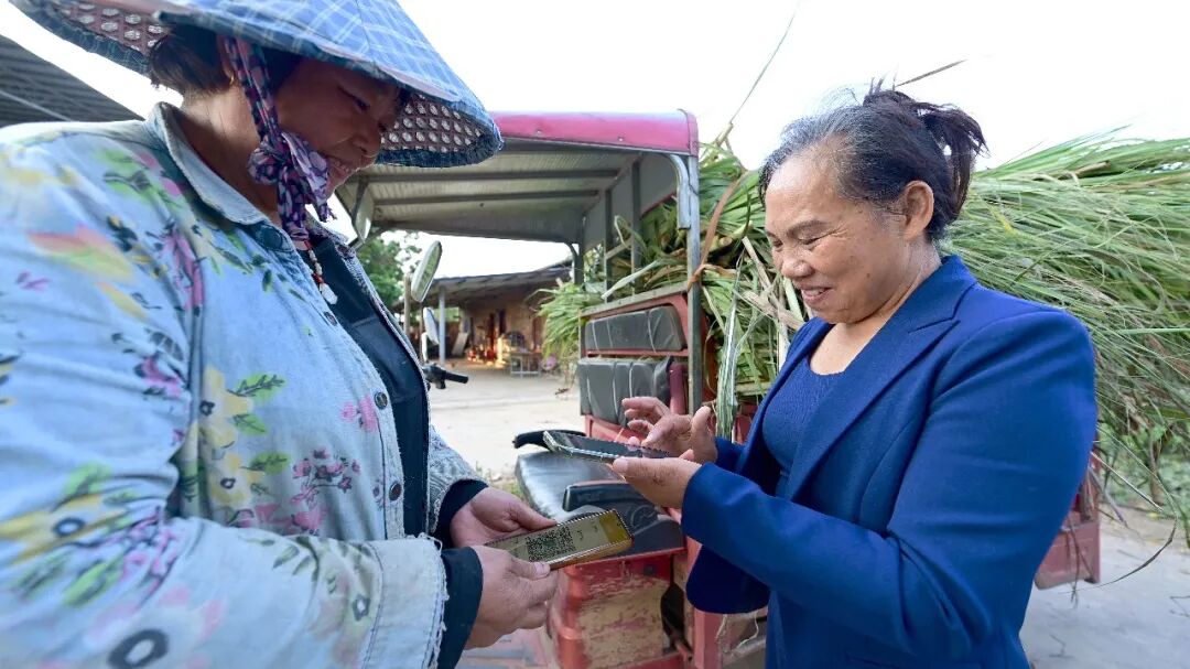 2月27日,王飞朝通过微信支付给村民苏志坚付甘蔗尾叶款。韦世仙 摄