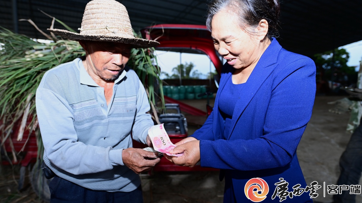 王飞朝给村民凌维礼支付甘蔗尾叶款。记者 朱新华 通讯员 韦世仙 摄
