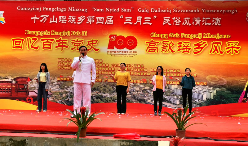为深入贯彻落实习近平总书记关于党史的重要论述,庆祝中国共产党成立100周年,结合民族团结进步宣传月活动安排,市农业农村局机关党委组织党员、入党积极分子在4月14日防城区十万山瑶族乡“三月三”民俗活动期间,开展“感党恩 跟党走 高歌瑶族风采”主题党日活动。