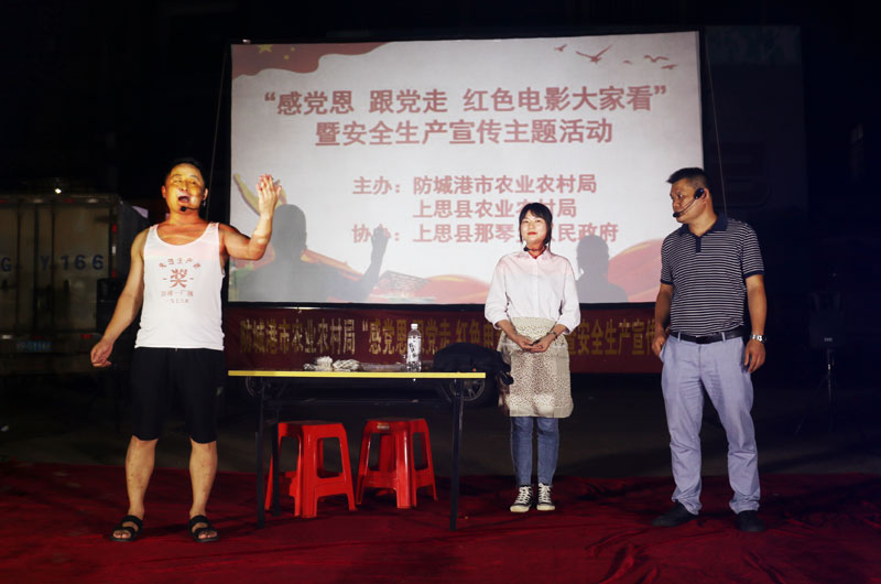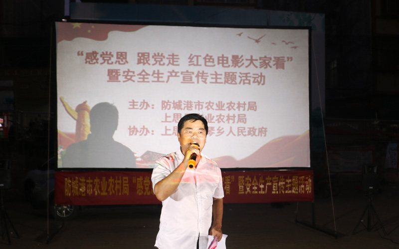 2021年5月17日,防城港市农业农村局联合上思县农业农村局、上思县那琴乡人民政府在上思县那琴乡农贸市场组织开展了“感党恩 跟党走 红色电影大家看”暨安全生产宣传主题活动。