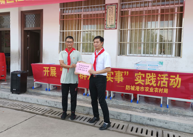 6月9日,防城港市农业农村局联合防城港市住房公积金管理中心、防城港市土地征收储备中心等驻村后盾单位及防城区江山镇潭西村委在三块石小学举行捐赠助学仪式。这是市农业农村局推动党史学习教育与各项具体工作紧密结合,深入开展“我为群众办实事”实践活动,解决群众“急难愁盼”问题的又一具体举措。
