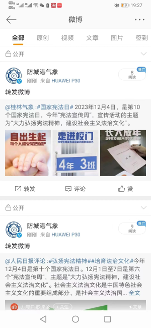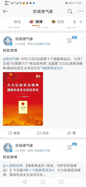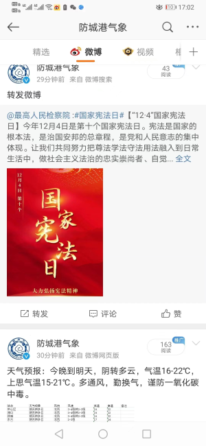 二是依托现有媒体渠道,利用气象宣传媒体,在“防城港气象”微博、微信公众号、手机短信、天气预报影视栏目、干部职工微信群开展“习近平新时代中国特色社会主义思想特别是习近平法治思想、习近平文化思想;宪法;社会主义法治文化;党的十八大以来全面依法治国取得的成就”等相关内容的宣传。