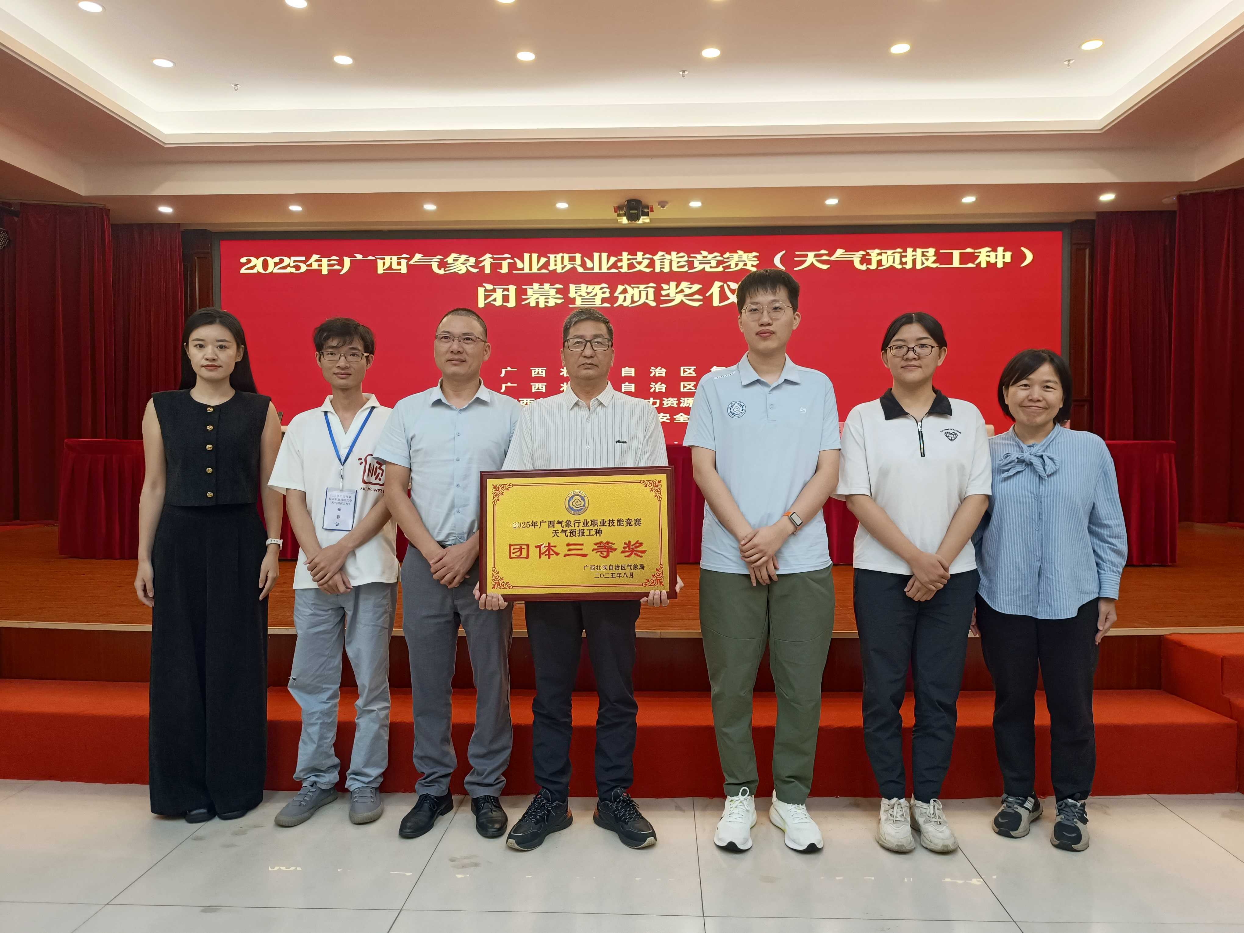 8月29日,2025年广西气象行业职业技能竞赛(天气预报工种)在南宁圆满落幕,我局荣获团体三等奖,1人获“历史个例天气预报”单项一等奖的优异成绩。