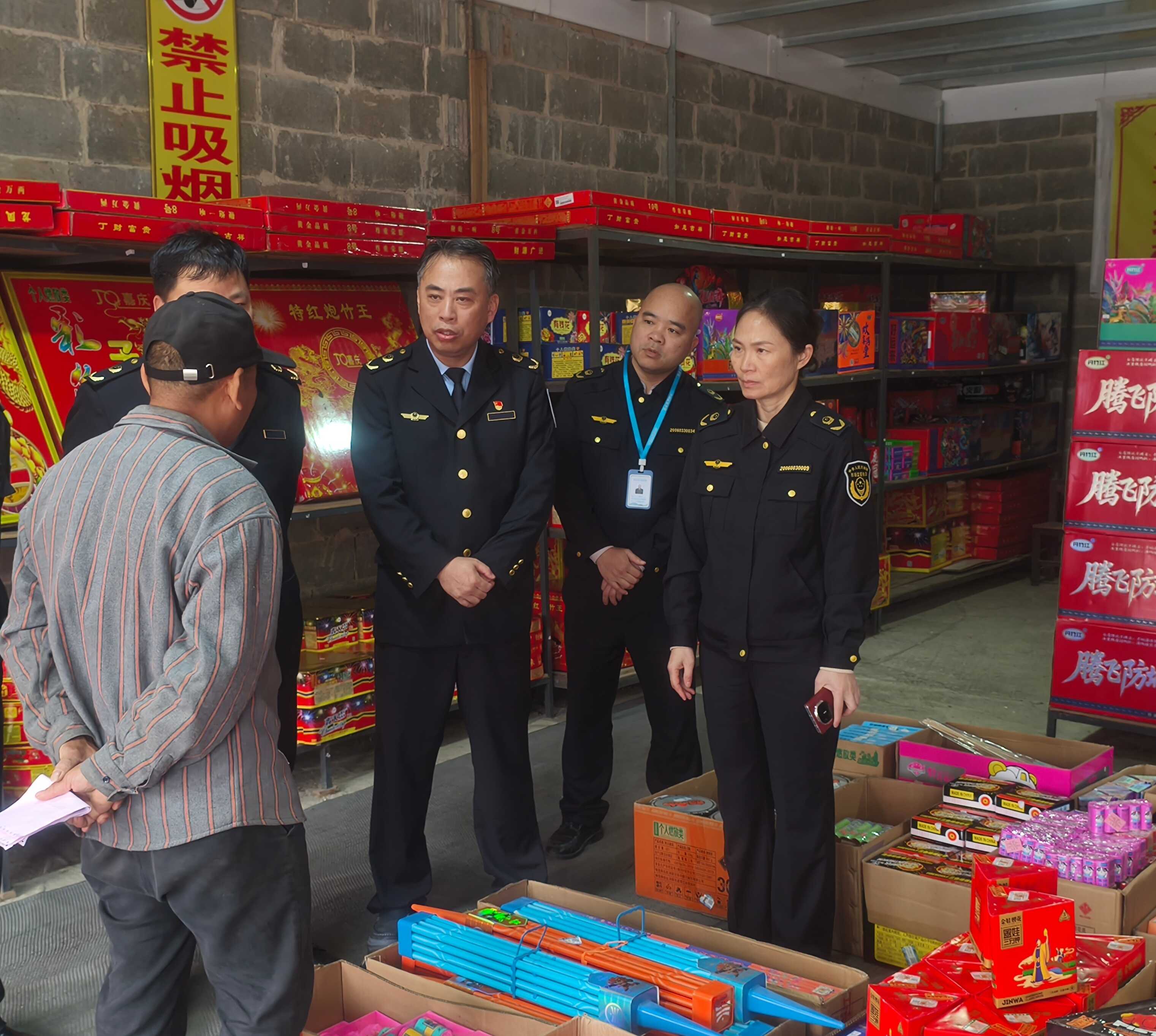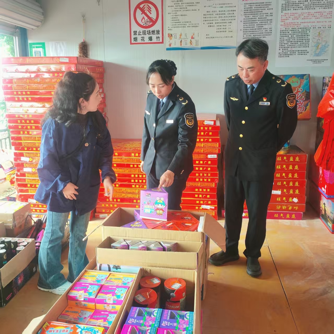执法人员检查烟花爆竹储存与摆放安全