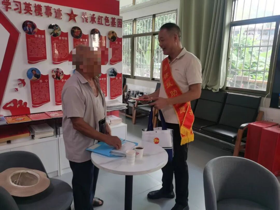 图为法律援助志愿者向退役军人赠送法治宣传资料