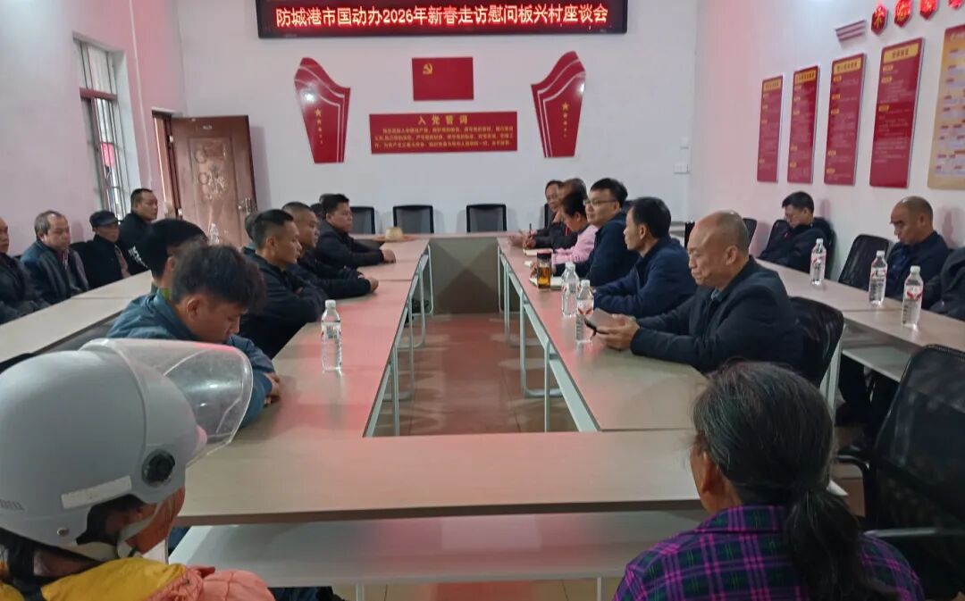 慰问组在板兴村党群服务中心与村“两委”干部,驻村第一书记、工作队员以及防城港市国动办结对帮扶对象等召开座谈交流会。会上,防城港市国动办领导对板兴村圆满完成村“两委”换届选举工作表示祝贺,对新班子展现出的新气象、新面貌给予充分肯定,希望新一届村“两委”班子凝心聚力、务实担当,切实发挥基层党组织战斗堡垒作用,团结带领全村群众共谋发展、共促振兴。双方围绕板兴村产业发展、基础设施建设、民生保障等重点工作深入交流,详细了解当前发展现状、存在困难和下一步工作思路,共同谋划新年度结对共建重点任务。防城港市国动办领导表示,将一如既往履行好结对共建责任,立足国防动员(人民防空)、边海防职能优势,上下联动,在政策支持、强边固防、为民服务等方面持续发力,积极为村里办实事、解难题,全力支持新一届村“两委”班子开展工作,推动乡村振兴各项工作再上新台阶。