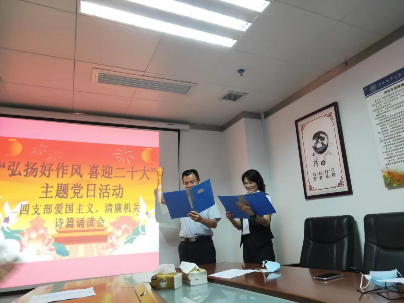 活动举办了爱国主义、清廉机关诗篇诵读会,诵读活动内容丰富,题材广泛,形式多样,既有个人朗诵、也有男女声合诵等。选手们用一首首慷慨激昂的诗歌,一段段扣人心弦的配乐,一句句铿锵有力的话语,以真挚的情感弘扬清风正气,礼赞廉洁担当,展现出中华传统经典的强大魅力,展现了第四党支部党员干部们忠诚、干净、担当的政治本色。