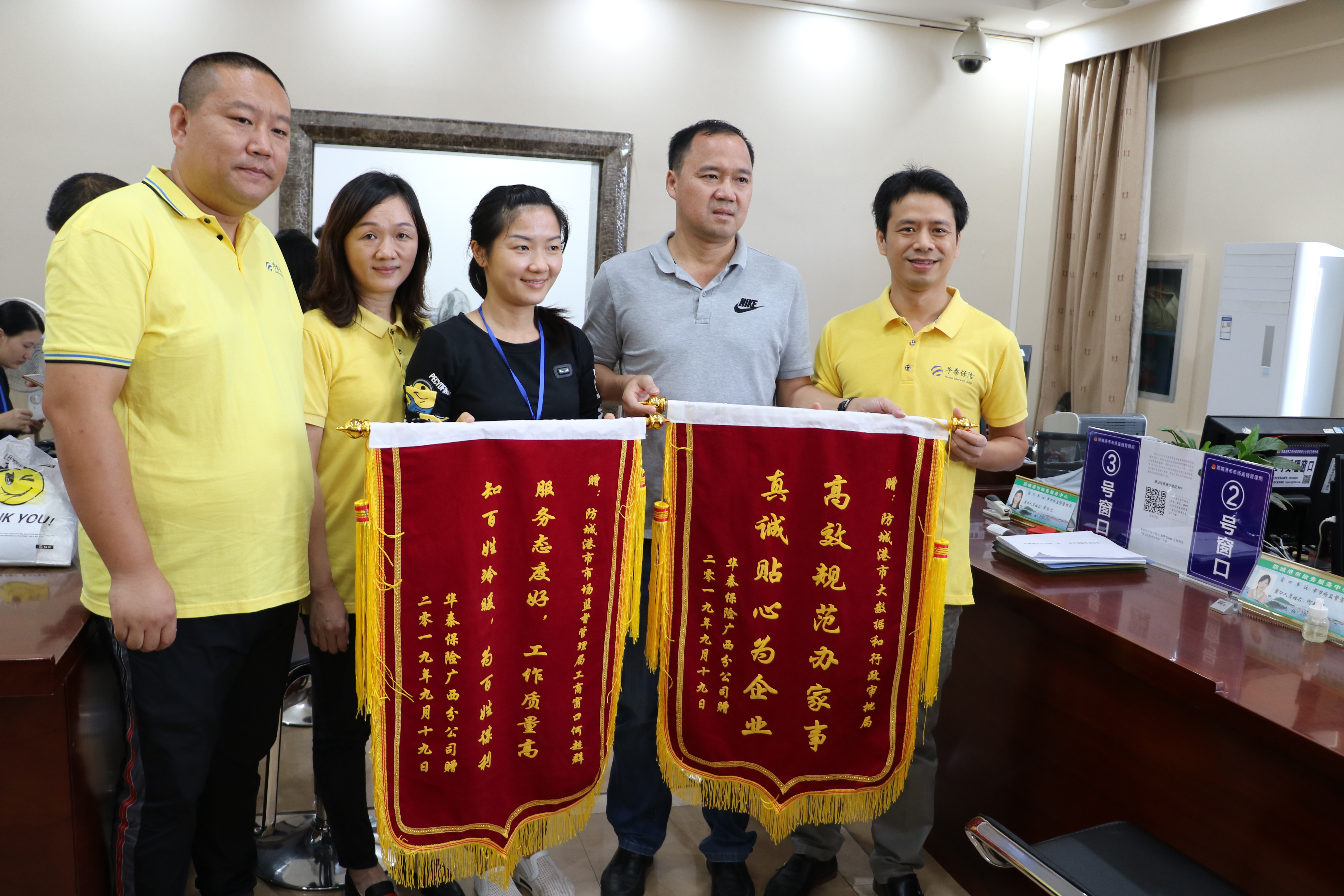 10月18日,华泰保险广西分公司负责人怀着喜悦的心情,率领部分员工来到市政务服务中心,将绣着“高效规范办实事 真诚贴心为企业”和“服务态度好 工作质量高”的锦旗,分别送到市大数据和行政审批局领导和市场监督管理局窗口工作人员手上,高度赞扬市政务服务中心的工作人员在为其办理公司营业执照时服务态度好,办事效率高效规范,真诚贴心为企业排忧解难,办好实事。