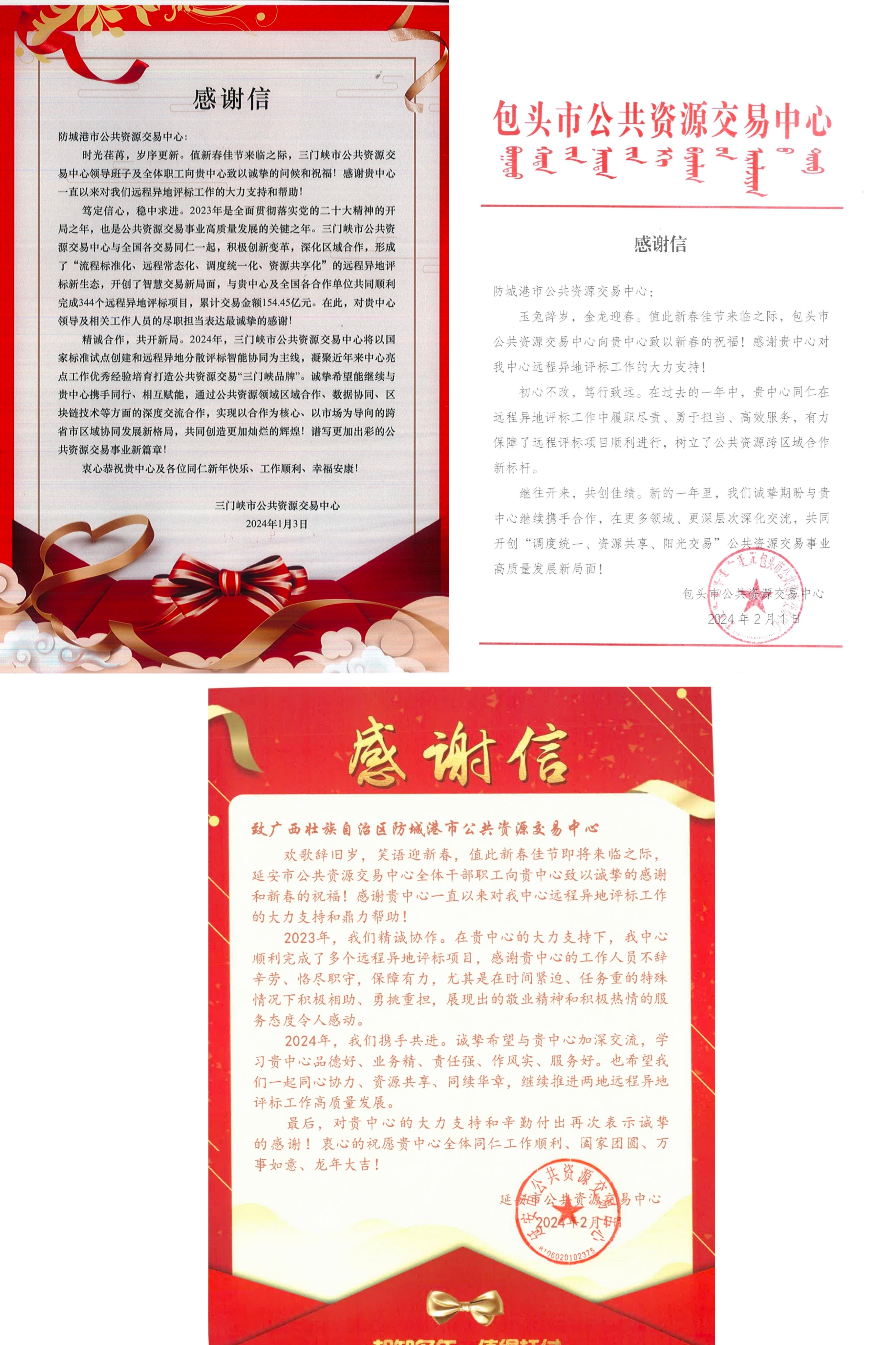 新春佳节来临之际,防城港市公共资源交易中心收到来自跨区域合作“朋友圈”的问候和祝福——延安市公共资源交易中心、三门峡市公共资源交易中心和包头市公共资源交易中心的感谢信。信中写到,感谢防城港市公共资源交易中心一直以来对其远程异地评标工作的大力支持和帮助,希望新的一年里与防城港市携手共进、相互赋能,通过公共资源领域区域合作、数据协同等方面的深度交流合作,实现以合作为核心、以市场为导向的跨省市区域协同发展新格局。